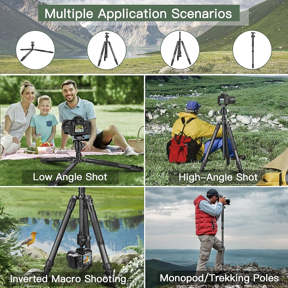 【Professional Tripod】Twist Locks that open with a quarter turn to extend to a maximum height of 76" or collapse the 4-sections of the leg in a quick. Three variable leg angles accommodate uneven terrain, with short center column allow you to shoot at a minimum height of 13", making it perfect for outdoor shooting and hunting.