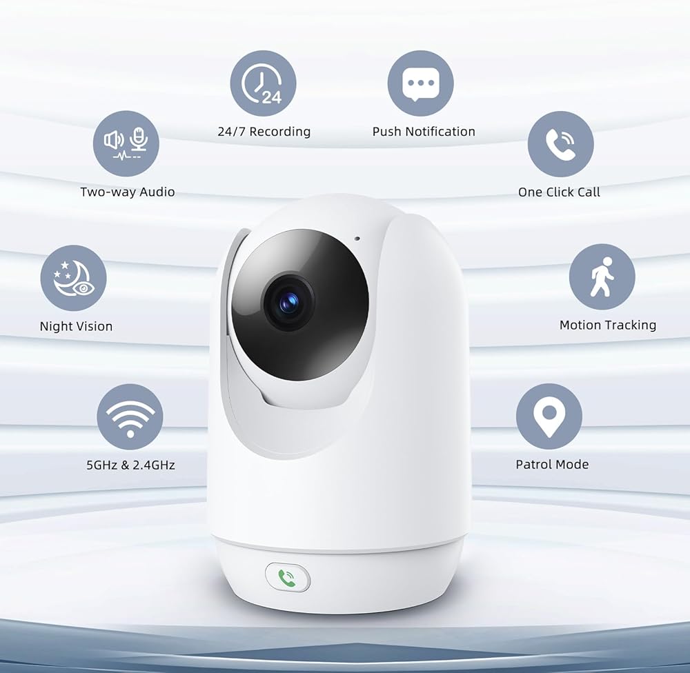 كاميرا أمان داخلية، كاميرات واي فاي 5G 2.4G للمنزل مع دورية، كاميرا للحيوانات الأليفة/الأطفال مع تطبيق الهاتف، مكالمة بنقرة واحدة، عموم/إمالة، صوت ثنائي الاتجاه، اكتشاف الإنسان، تتبع تلقائي، 24/7، تعمل مع Alexa