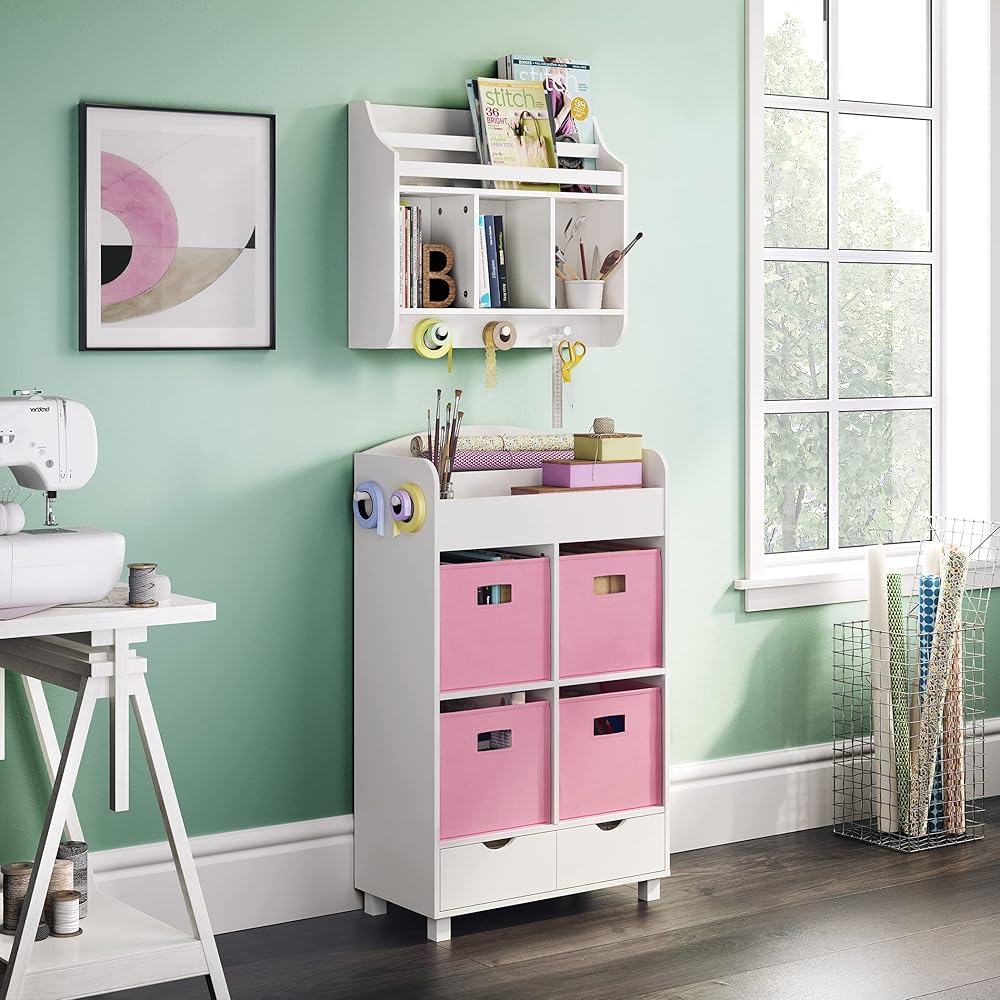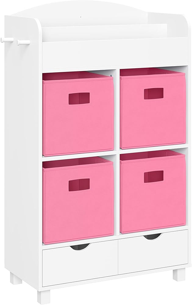 Crafted with a sturdy MDF frame and a beautiful white painted finish, this kids' storage organizer seamlessly blends into any room's decor. The included hooks provide a convenient spot for hanging backpacks or jackets, while the optional two-piece folding storage bins offer extra toy storage options. With a weight capacity of up to 120 lbs, this robust unit can handle even the most extensive toy collections.