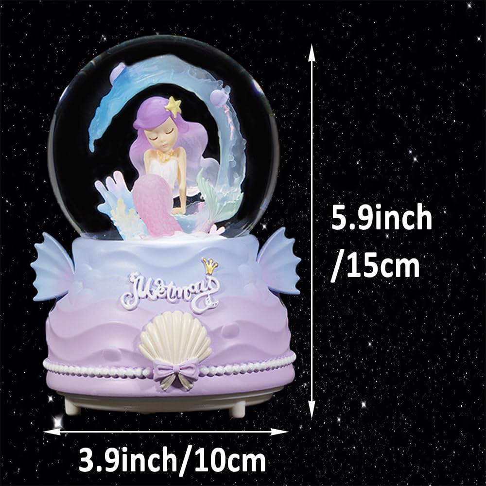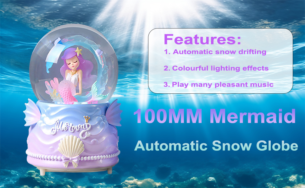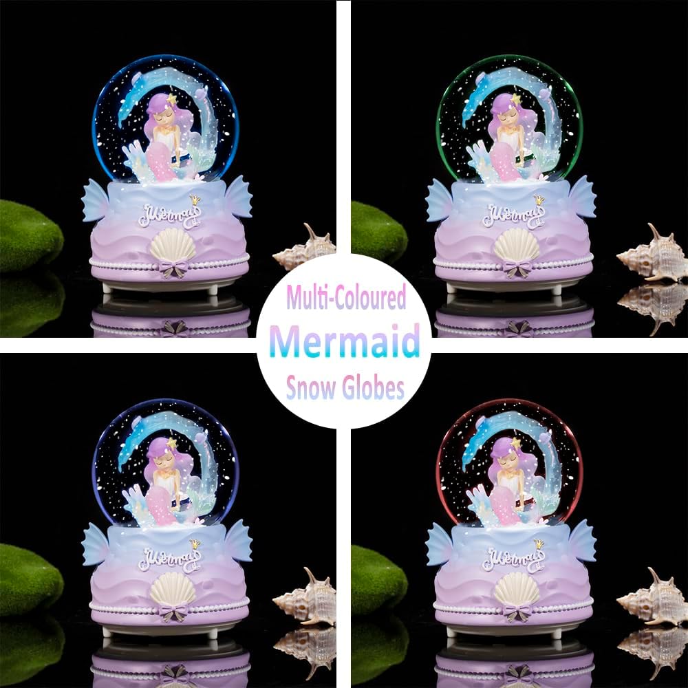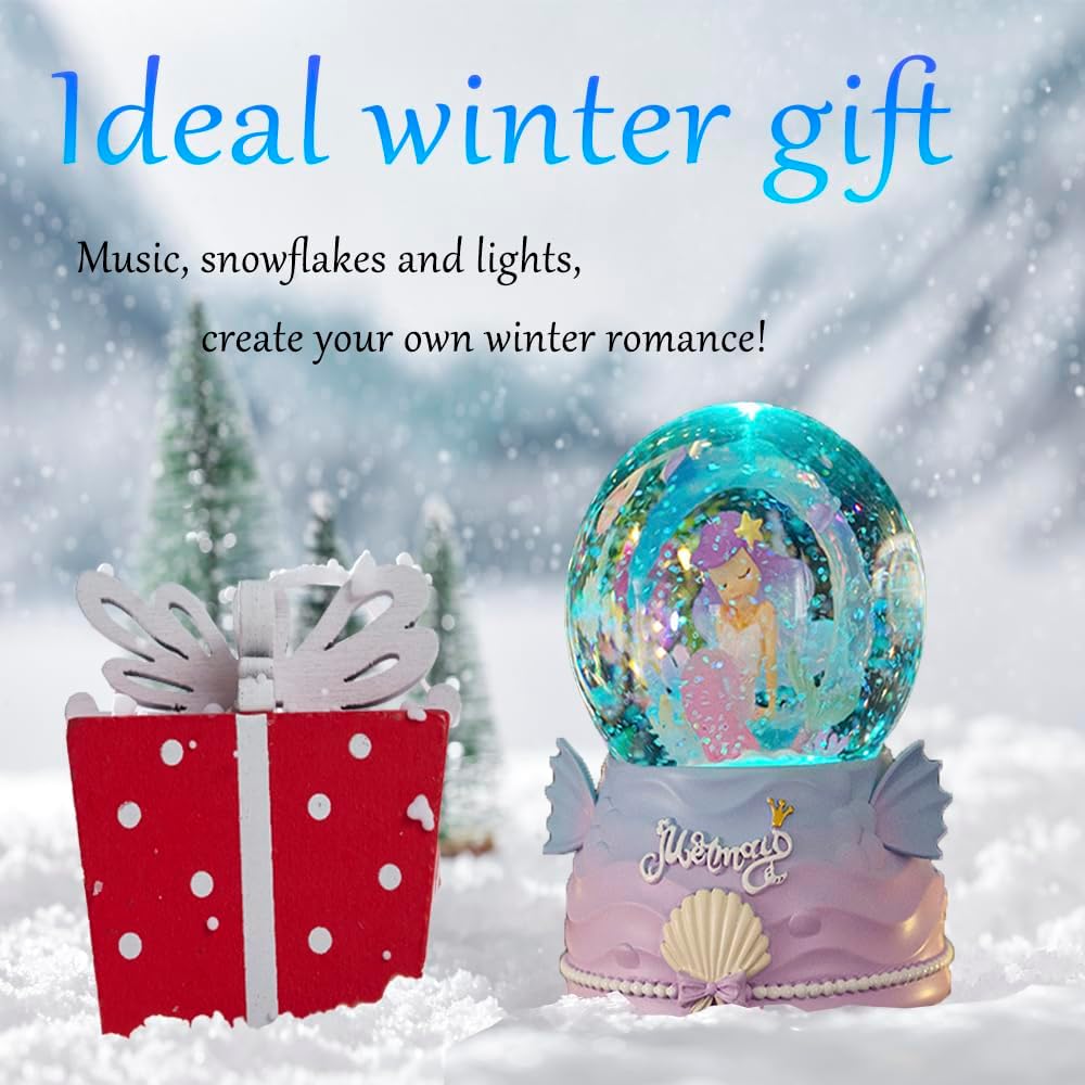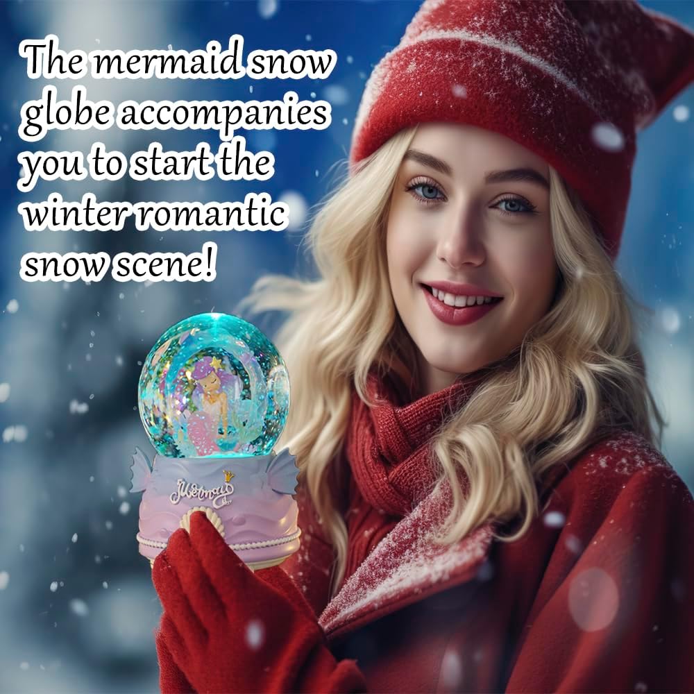 Snow Globes for Kids, 100MM Mermaid Snow Globes for Girls, Snow Globes Christmas with Music & Colorful Lights & Automatic Snowflakes, Gifts for Girls, Birthday Christmas Festival