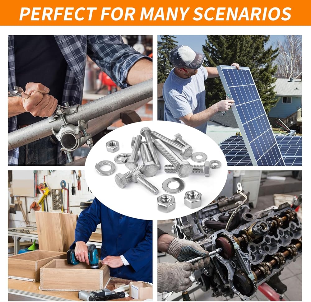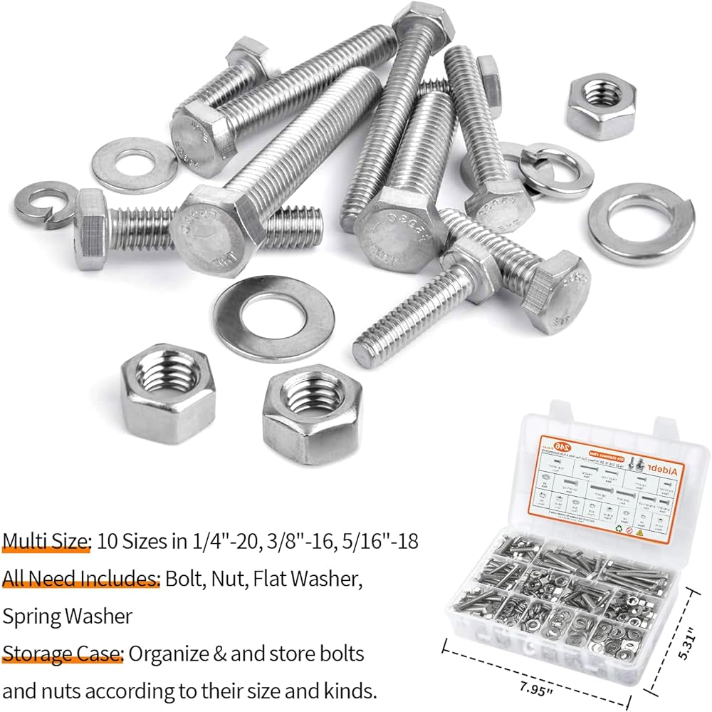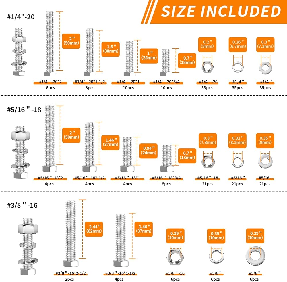 【تتضمن 246 قطعة】: تأتي العبوة مع 246 قطعة في 10 أحجام من مجموعة متنوعة من الصواميل والمسامير، والتي تتضمن أحجام مختلفة من 1/4"-20، 5/16"-18، 3/8"-16 صواميل ومسامير، مسطحة و غسالات زنبركية بأحجام مختلفة تلبي احتياجاتك المتعددة.