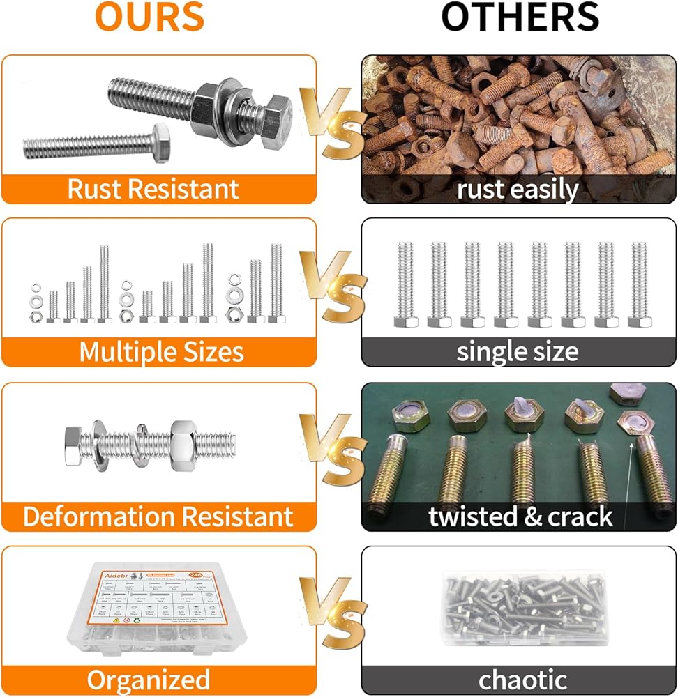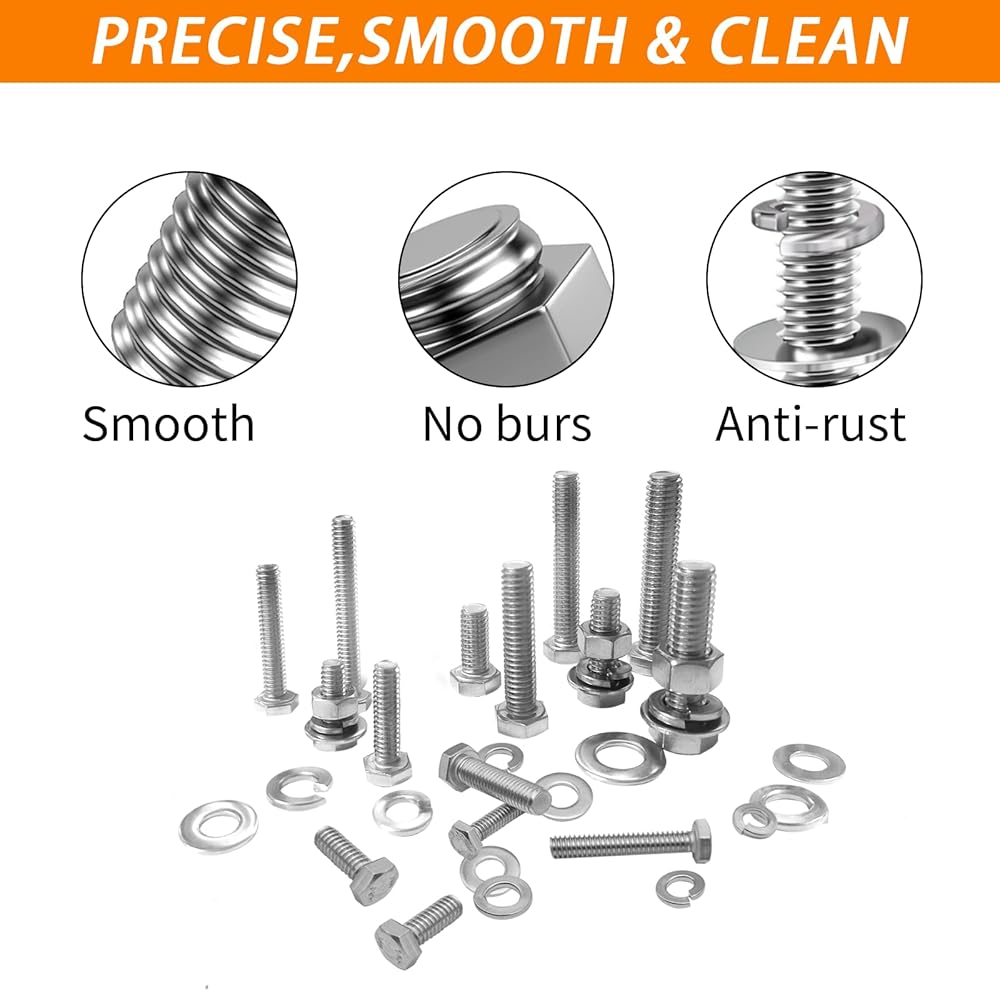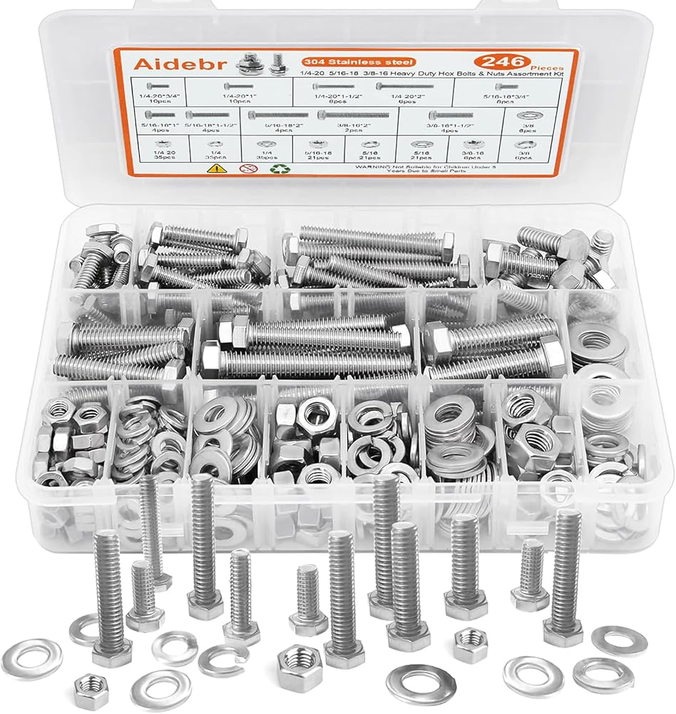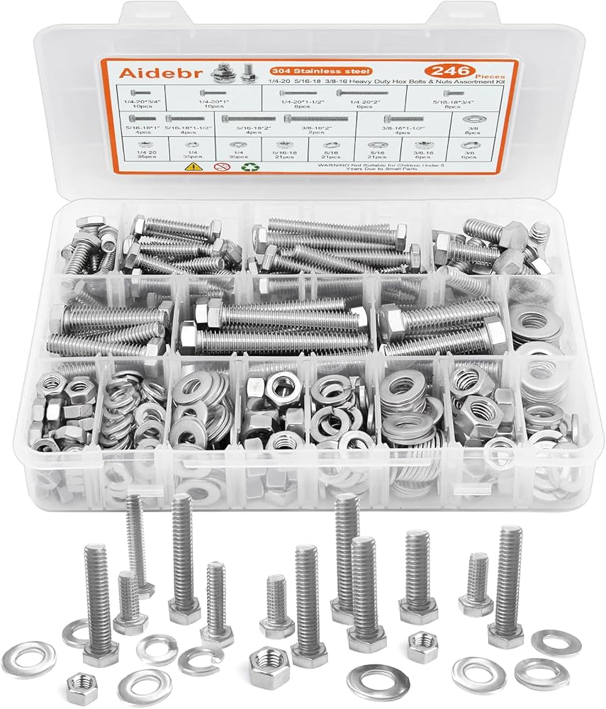 【تتضمن 246 قطعة】: تأتي العبوة مع 246 قطعة في 10 أحجام من مجموعة متنوعة من الصواميل والمسامير، والتي تتضمن أحجام مختلفة من 1/4"-20، 5/16"-18، 3/8"-16 صواميل ومسامير، مسطحة و غسالات زنبركية بأحجام مختلفة تلبي احتياجاتك المتعددة.