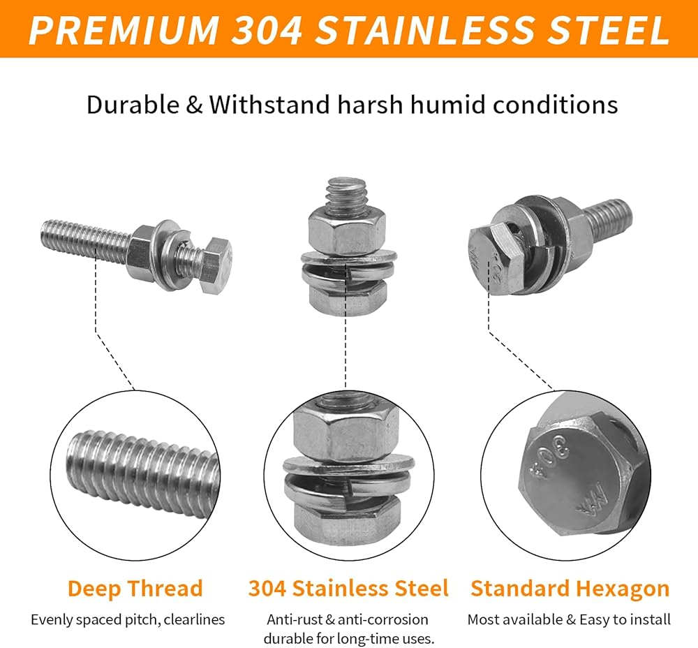 【الفولاذ المقاوم للصدأ الفاخر 304】: المجموعات المتضمنة صواميل ومسامير وغسالات مصنوعة من الفولاذ المقاوم للصدأ الفاخر، الذي يتميز بصلابة كبيرة، وهو قوي ومتين، ويمكن أن يكون مضادًا للصدأ، ومضادًا للأكسدة، ومضادًا للتآكل، ومضادًا للتآكل. تأكد من أنها مدة طويلة للاستخدام وسهولة التخزين.