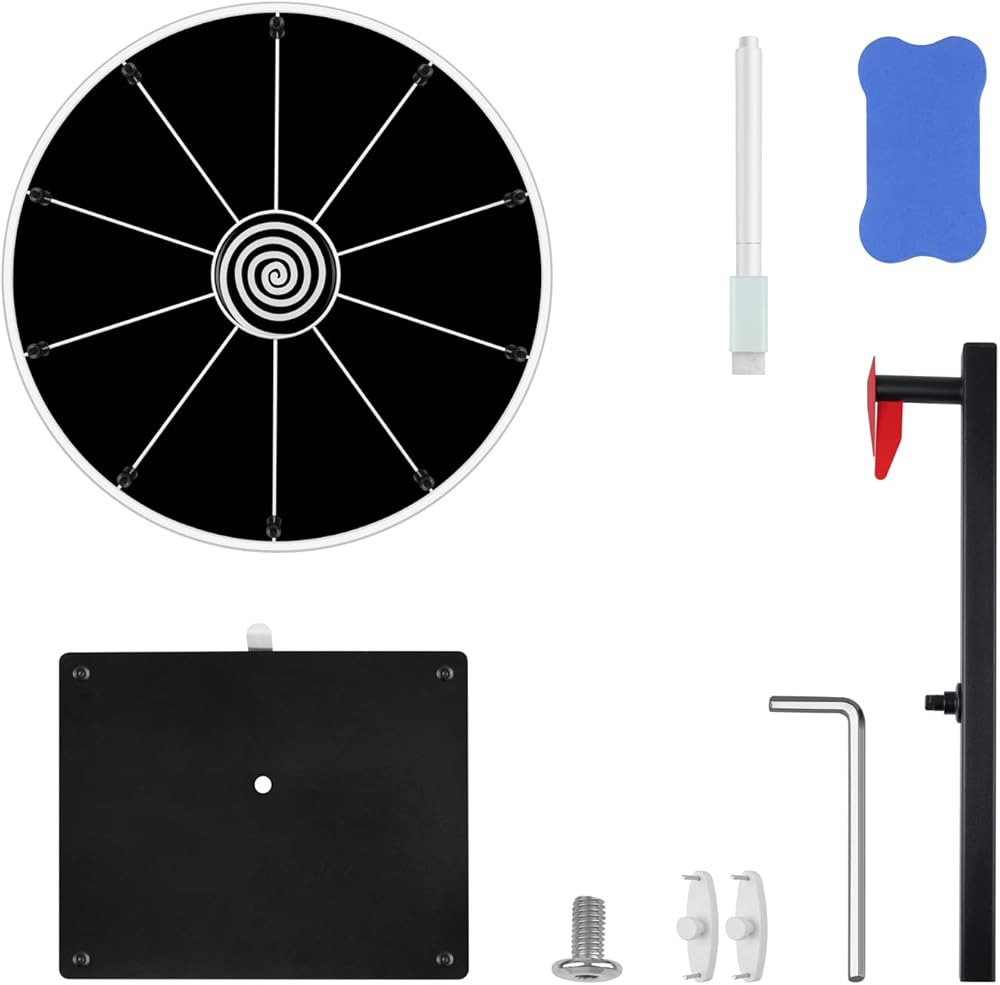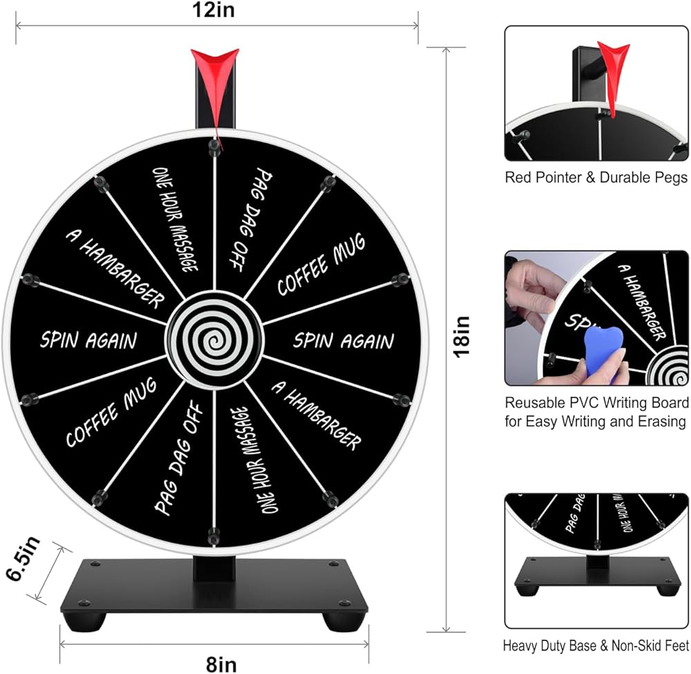 • Dynamic Customization Our prize wheel takes engagement to the next level with a PVC surface that doubles as a whiteboard. Effortlessly customize your gaming experience using a whiteboard marker no limitations on creativity