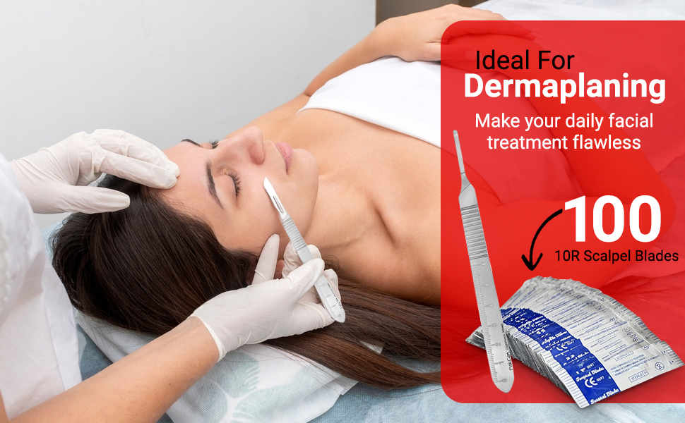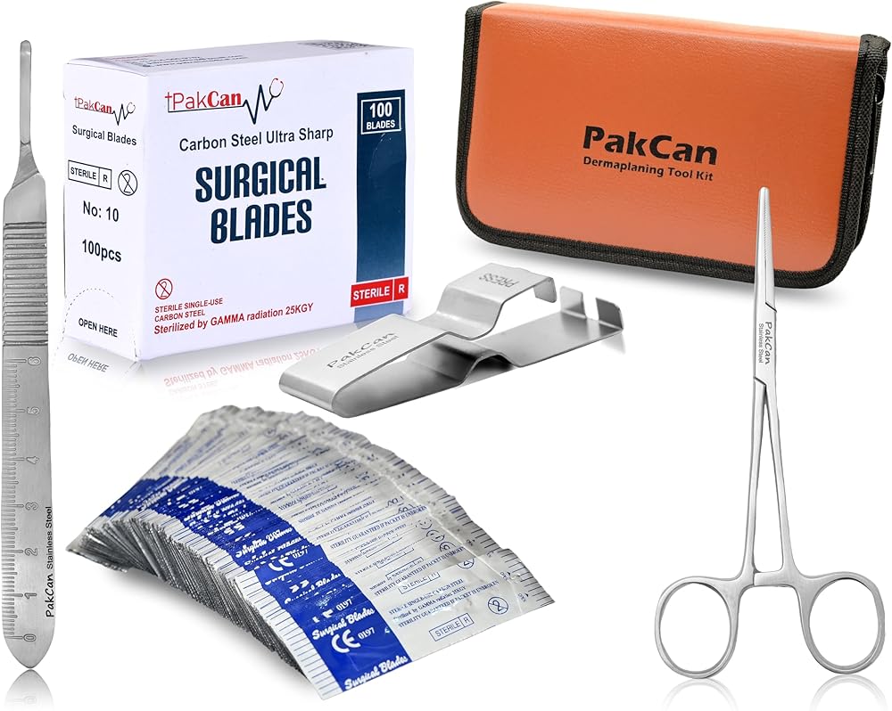 مجموعة أدوات تقشير الجلد الاحترافية مكونة من 4 قطع - مقبض مشرط من الفولاذ المقاوم للصدأ 3، مرقأة لتركيب الشفرات، مزيل الشفرات، 100 شفرة ديرمابلان