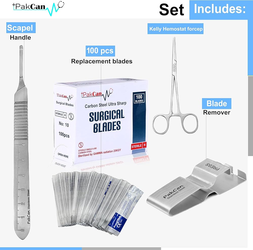 • تتضمن هذه المجموعة المكونة من 4 قطع ما يلي: عدد 100 شفرات مشرط من الفولاذ المقاوم للصدأ 10R، 1 × 3.5 بوصة طرف مستقيم كيلي هيموستات، 1 × شفرة مقبض رقم 3، 1 × مزيل شفرة