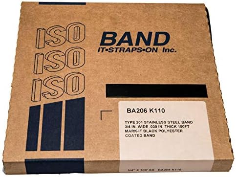 ISO BA206 K110T Type 201 Stainless Steel Black Coated Band 3/4" wide x .030" thick x 100' foot roll in tote. It Straps On, Inc., the band and buckle experts are providers of high-quality stainless steel banding, buckles, wing seals, and sign brackets. ISO is an American manufacturer, and our stainless steel is melted and manufactured in the USA to ASTM Standards. It Straps On, Inc. products are a perfect choice anytime your application requires strength, durability, and corrosion resistance. Type 201 Stainless Steel is an austenitic chromium-nickel-manganese stainless steel that has been fully annealed. It is nonmagnetic when it has been annealed. It can become slightly magnetic if it has been cold worked. Use with ISO Type 201 BOBU256 buckles or ISO Type 201 BOWS156 wing seals. Easily installs with the following tools: Cool Tool #T001, Ratchet Tensioner #T101, Self-Opening Spring Cutter #T502, Medium Band Cutter #T545, Tensioning Tool #T1916, and Crimping Tool #T1952