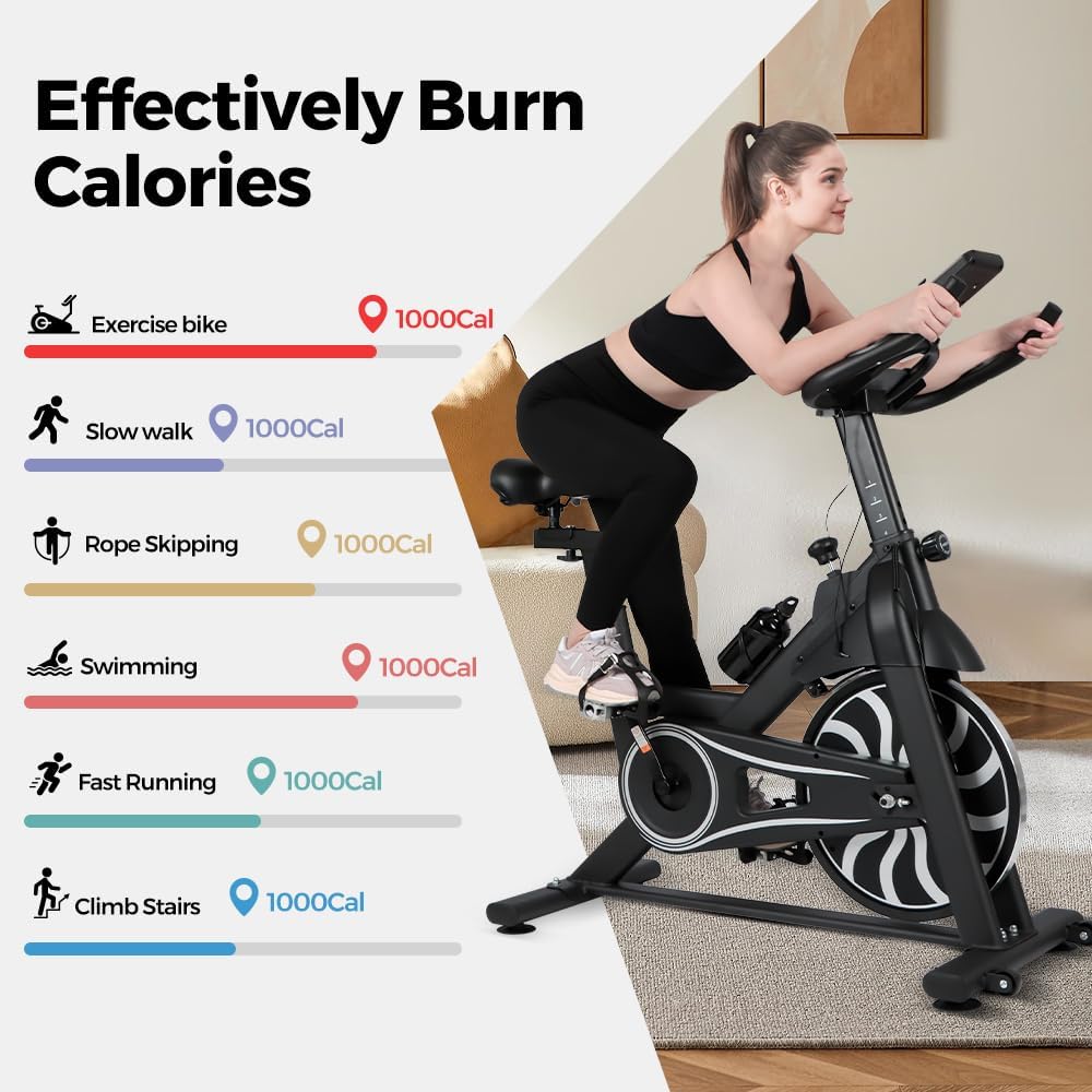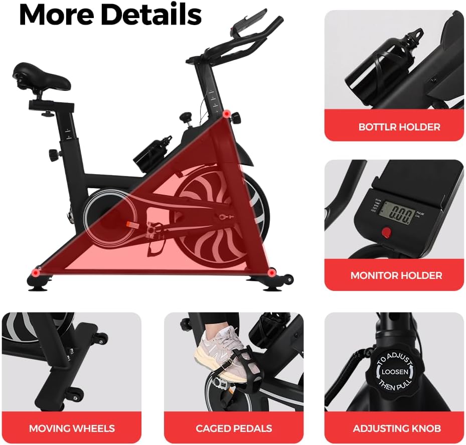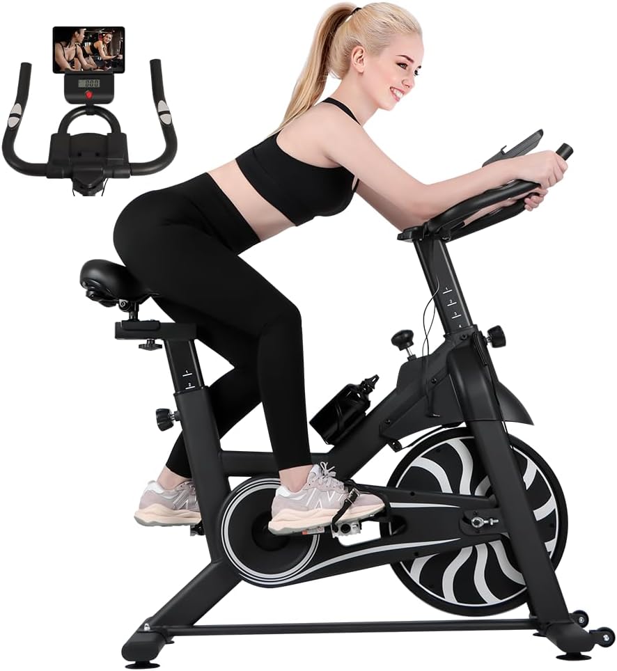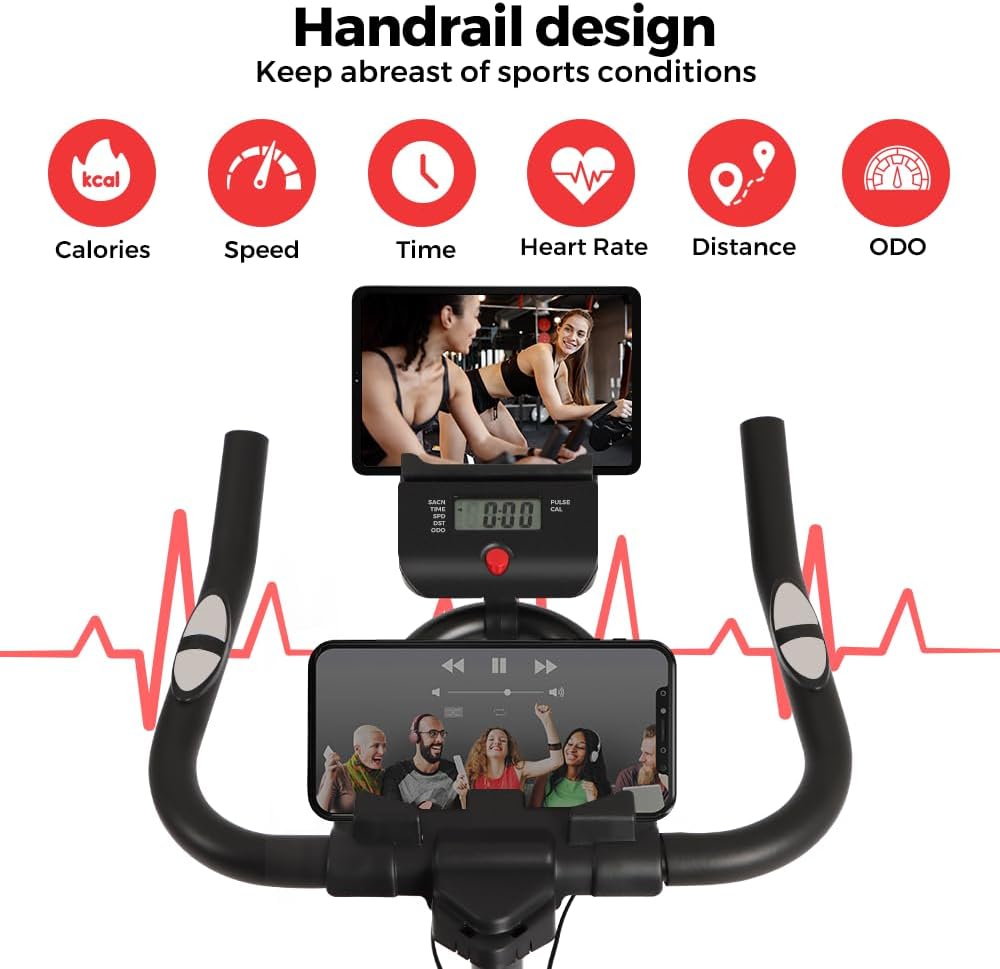 【 حامل شاشة LCD وحوامل الكمبيوتر اللوحي 】 تأتي دراجة التمرين الخاصة بنا مع شاشة LCD رقمية مطورة تتتبع الوقت والسرعة والمسافة وعداد المسافات (أميال مدى الحياة)، والنبض والسعرات الحرارية المقدرة التي تم حرقها. يتضمن أيضًا أجهزة استشعار لمعدل ضربات القلب على المقاود لتتبع معدل ضربات القلب. تحتوي هذه الدراجة الداخلية على حاملين للأجهزة (حامل الهاتف وحامل الكمبيوتر اللوحي)، حتى تتمكن من الاستمتاع بالموسيقى أو الفيديو أثناء ممارسة التمارين. تشتمل دراجة التمرين أيضًا على حامل زجاجة ماء، مما يسمح لك بالبقاء رطبًا أثناء التمرين.