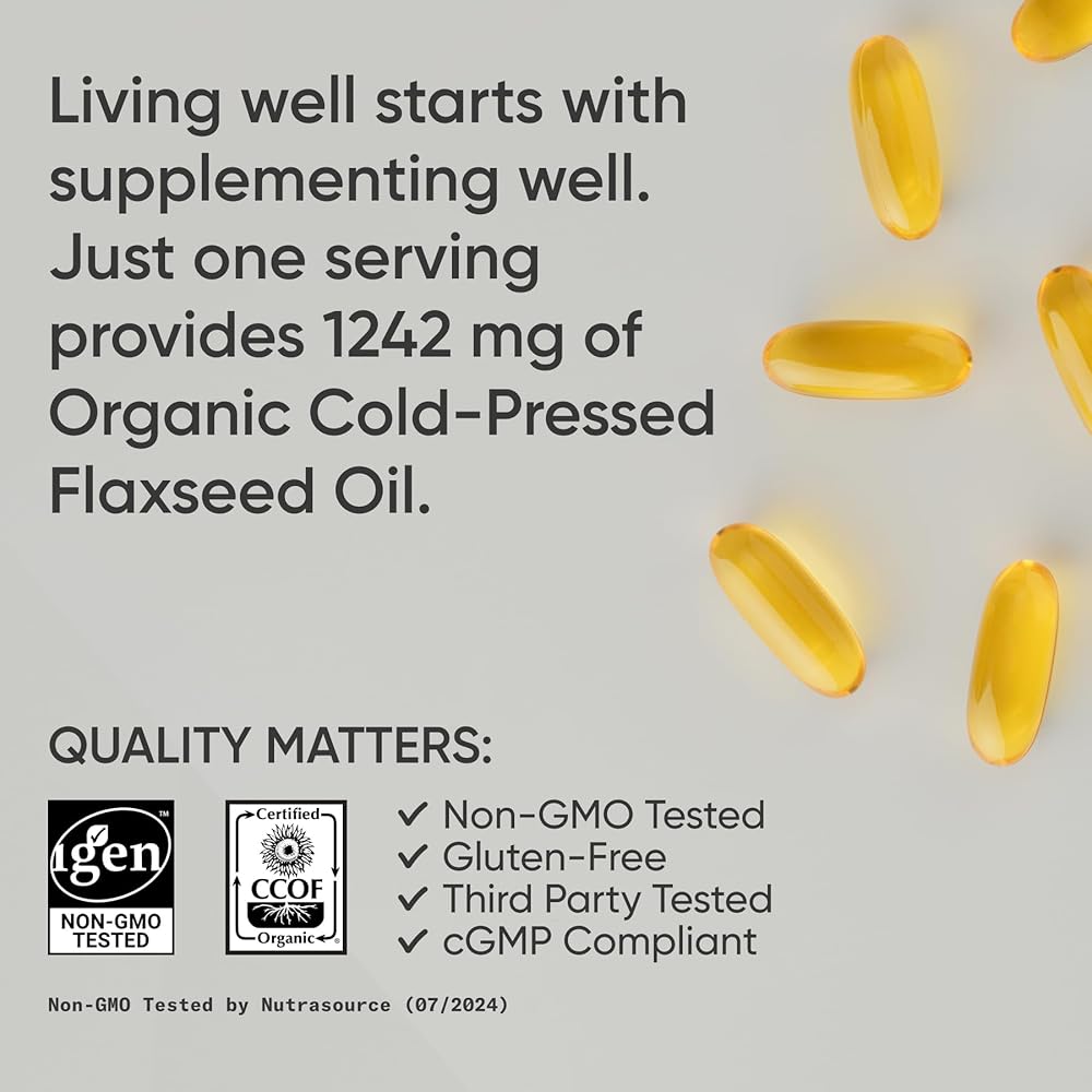كبسولات هلامية من زيت بذور الكتان بقوة إضافية 1242 ملجم - بديل زيت السمك أوميغا 3 النباتي للنساء والرجال - تم التحقق من عدم وجود كائنات معدلة وراثيًا، وخالي من الصويا والغلوتين (200 قطعة)