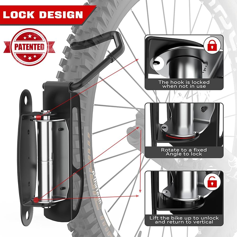 تصميم القفل: عندما لا تكون هناك دراجة معلقة، يكون الخطاف في حالة قفل مركزية، مما يجعل من السهل تعليق الدراجة دون أن يتمايل الخطاف إلى اليسار واليمين. بعد تعليق الدراجة، يتم فتحها تلقائيًا. عندما يتم تدويره حوالي 60 درجة إلى اليسار أو اليمين، فإنه يمكن أن يصل إلى حالة القفل على التوالي. لخلعها، ارفع الدراجة لأعلى قليلاً وسيتم فتحها.