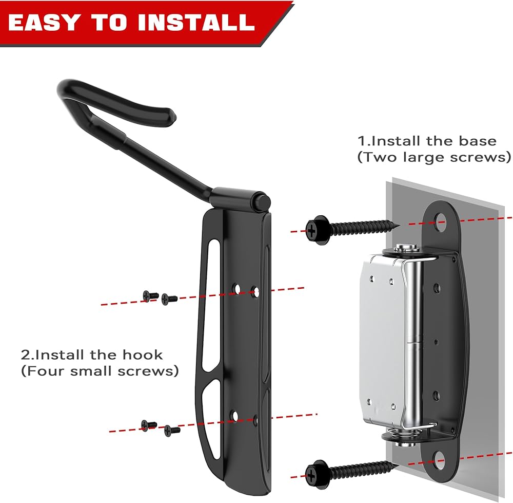 تصميم وقائي: خطافات مغطاة بالمطاط تمنع خدوش الدراجة وتلفها. يتم تأمين الدراجات عند تعليقها، ولكن من السهل خلعها من الرف عند الحاجة.