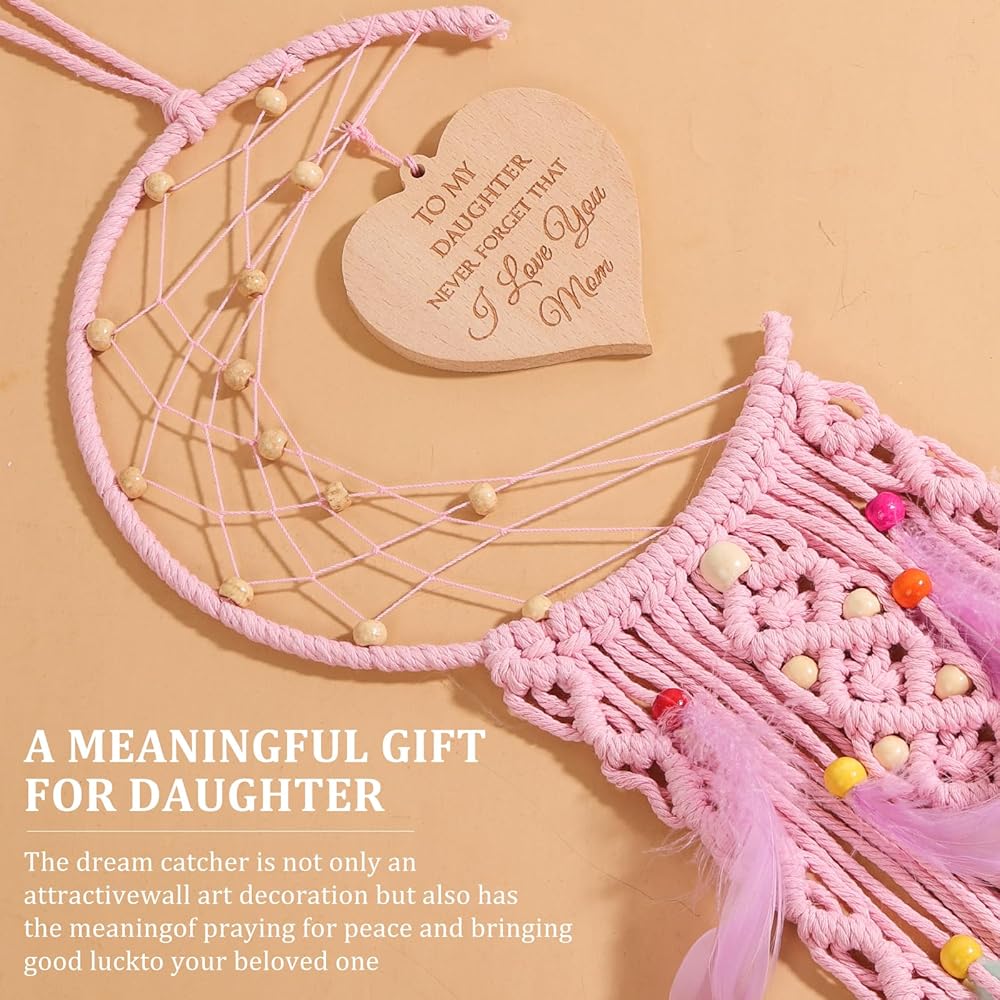 PERFECT CHRISTMAS GIFT FOR DAUGHTER: Crafted from premium beech wood, our heart pendant bears a touching message: "TO MY DAUGHTER, NEVER FORGET THAT I Love You Mom." Moon Dream Catchers make ideal Christmas and birthday gifts for daughters, showcasing your deep love and symbolizing an unbreakable bond between souls. Perfect for your beloved daughter, these gifts express heartfelt sentiments.