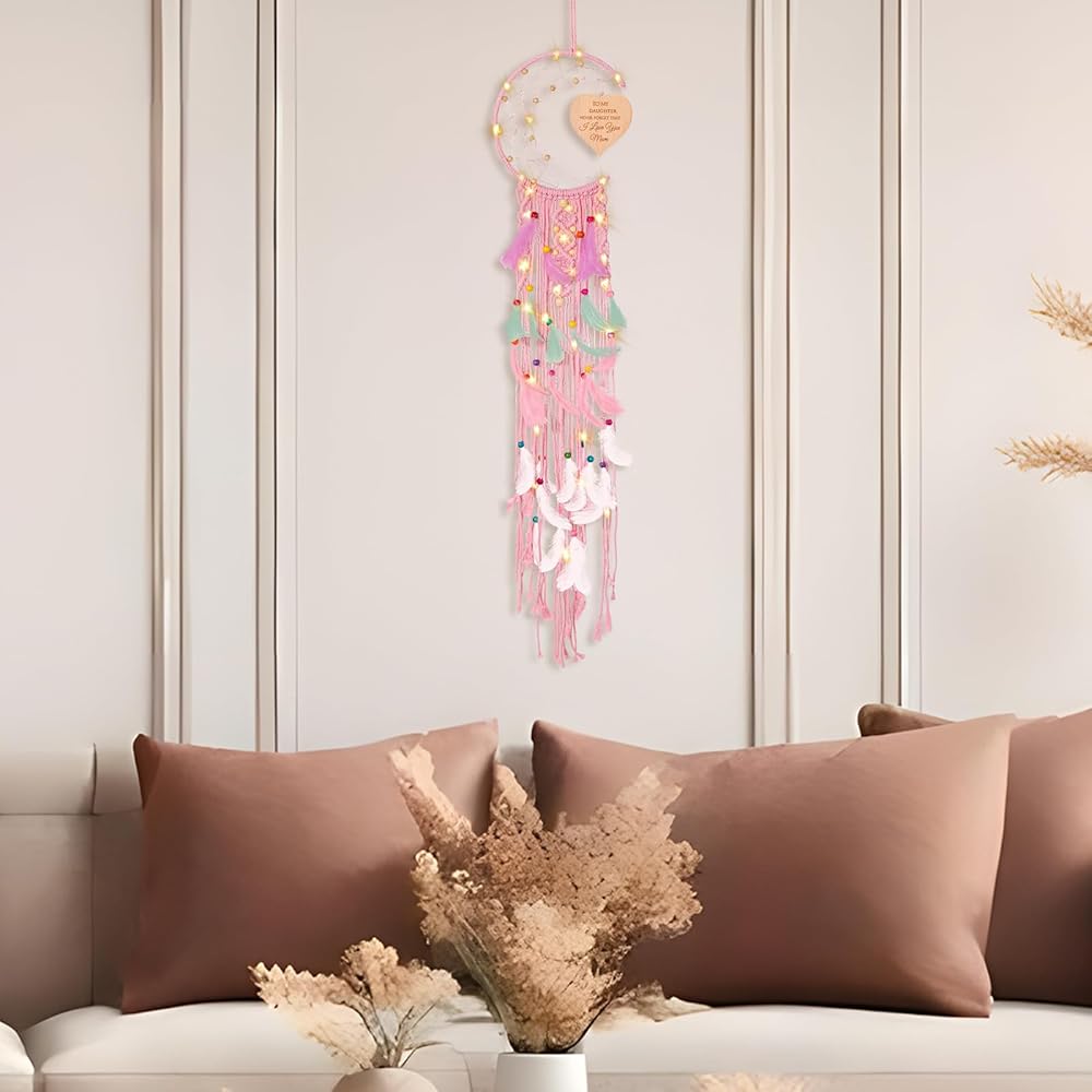 هدايا للابنة، هدايا ابنة من Moon Dream Catchers من الأم، ديكور معلق على الحائط من Boho Macrame مع إضاءة ليلية، ديكور من الريش، هدايا من الأم إلى الابنة، للابنة في القانون.