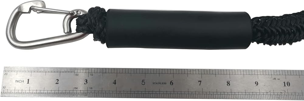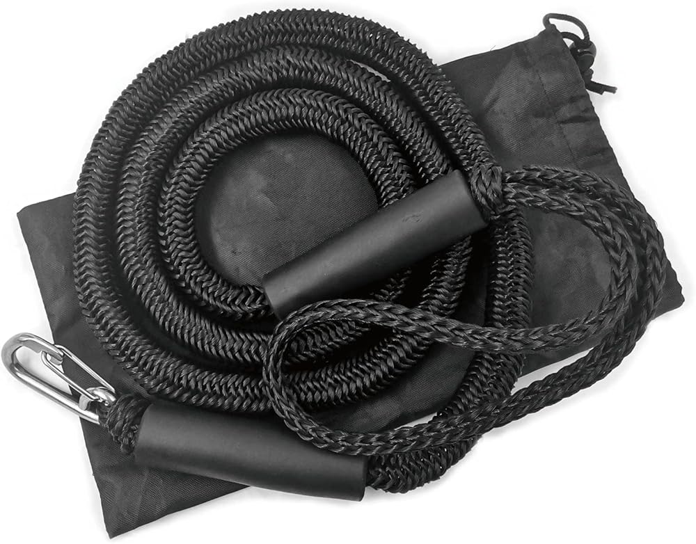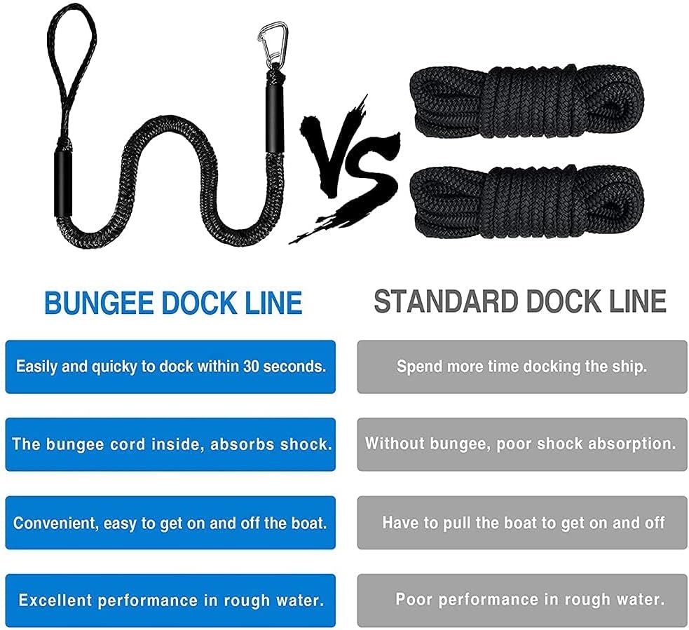 YANYU Stretches 7-14ft Premium PWC Anchor Bungee Dock Line Snubber Mooring Line Absorbs Shock to Anchors and Docks w/Stainless Steel 316 Clip Benefits: ✔ Boat dock lines with 10mm bungee cord inside and polyethylene braided rope outside. ✔ Peace of Mind and Security while your Boat is Docking. ✔ Eliminate the Jerking, Tugging, and Banging on your Boats and Anchor. ✔ “Stretches” as your Boat, Pontoon, PWC, Jet Ski, or Kayak Drifts from Rough Waves or Wind. ✔ Loop and Slider at each End for an Easy Attachment to your Boat, Dock, or Anchor. ✔ Package: 1 Pack 7 ft Bungee Dock line with snap hook(Stainless Steel 316). 1 pack Storage bag