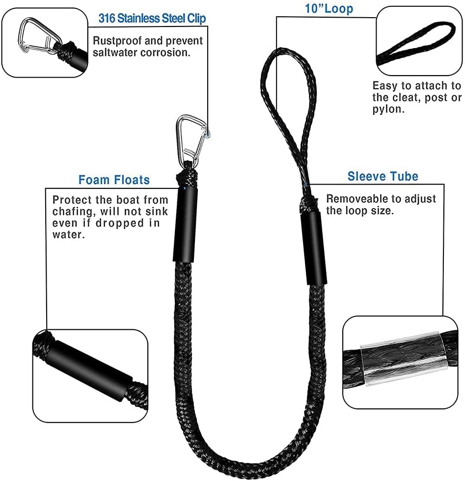 Boat dock lines & rope 7ft (stretch to 14ft ). The perfect length keeps the boat in good condition.Bungee dock lines have a tensile strength of 2200 lbs. (1000kg). Suitable for all motorized and non-motorized PWC, as well as small boats up to 4,500 lbs.Bungee Dock Line with stainless steel 316 snap hook on one end,resistant to seawater corrosion