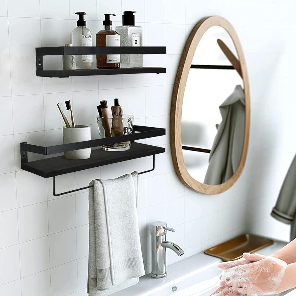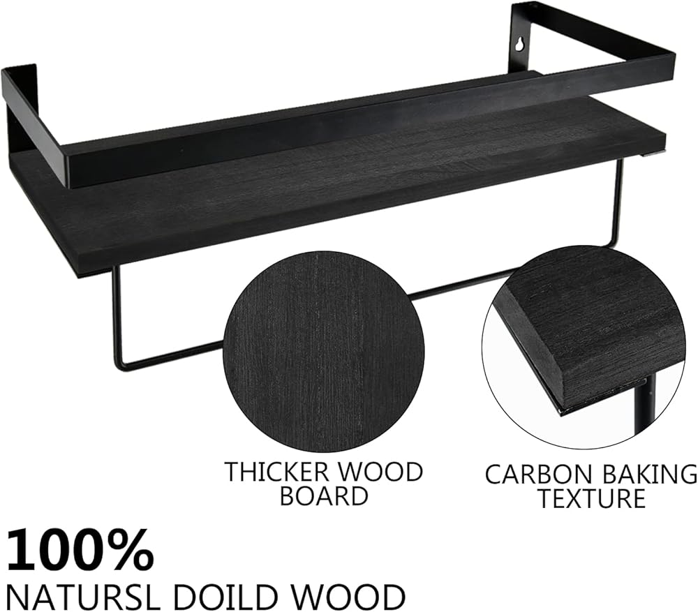 أرفف عائمة سوداء من Y&ME YM مع حامل مناشف - مجموعة من أرفف حمام مثبتة على الحائط، أرفف ديكور خشبية عائمة للتخزين الأنيق في الحمام والمطبخ وغرفة المعيشة وغرفة النوم