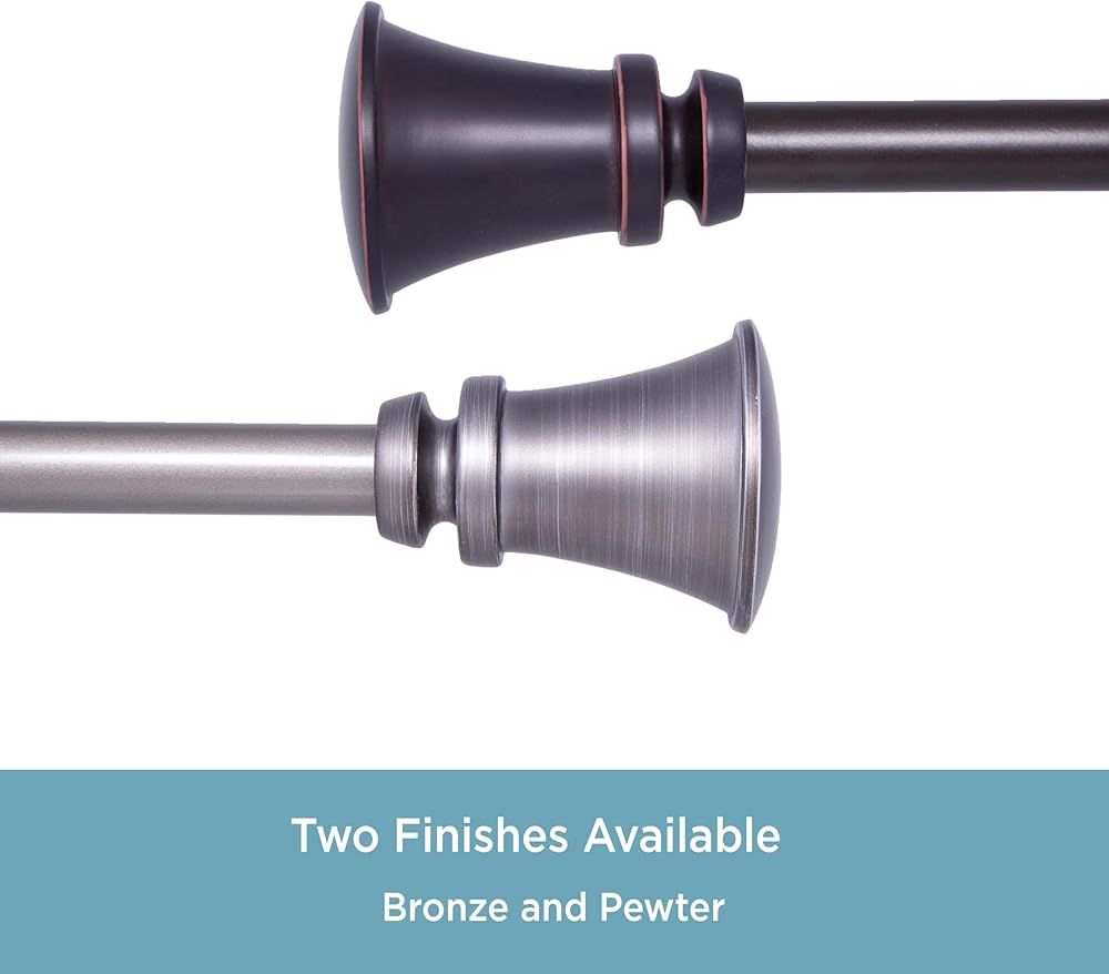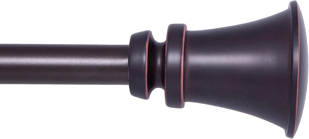 The 3/4 inch diameter Nile curtain rod in bronze features matching trumpet style finial ends. Use on medium to large size windows in your dining room, bedroom, or living room to hang medium to heavyweight curtains. The telescoping rod adjusts from 36 inches to 66 inches to fit your window and projects 3.73 inches from the wall. It is ideal for hanging curtains with pockets, grommets, back tabs, and tab tops, but can also be used with clip rings.