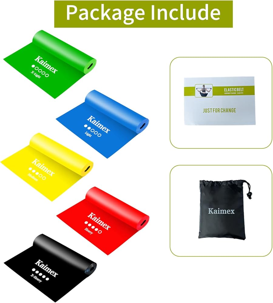 Packs include: 5xBands (Black Red Blue Yellow Green 59inchX5.9inch), 1×Carrying Pouch, 1×Exercise Guide