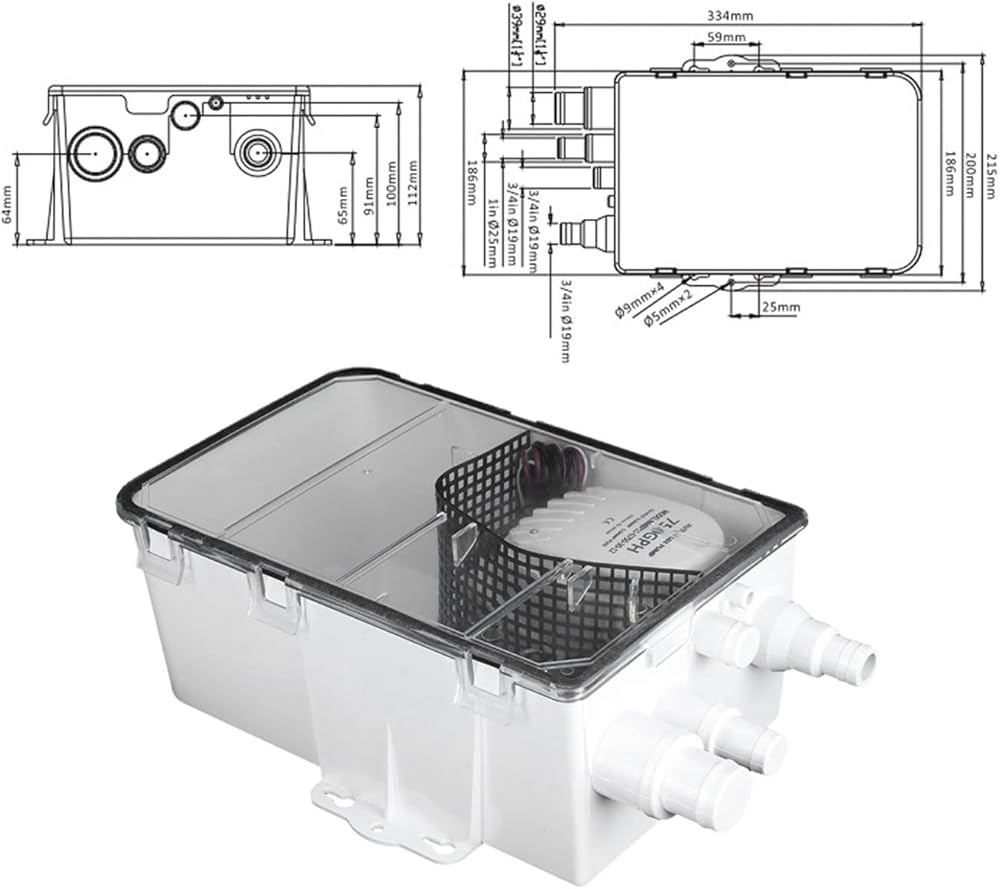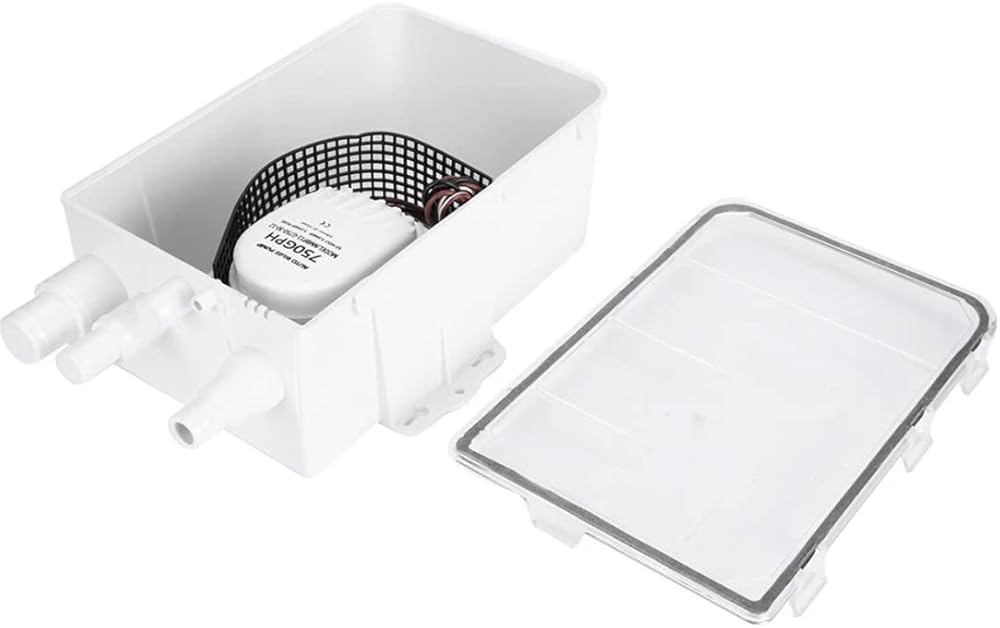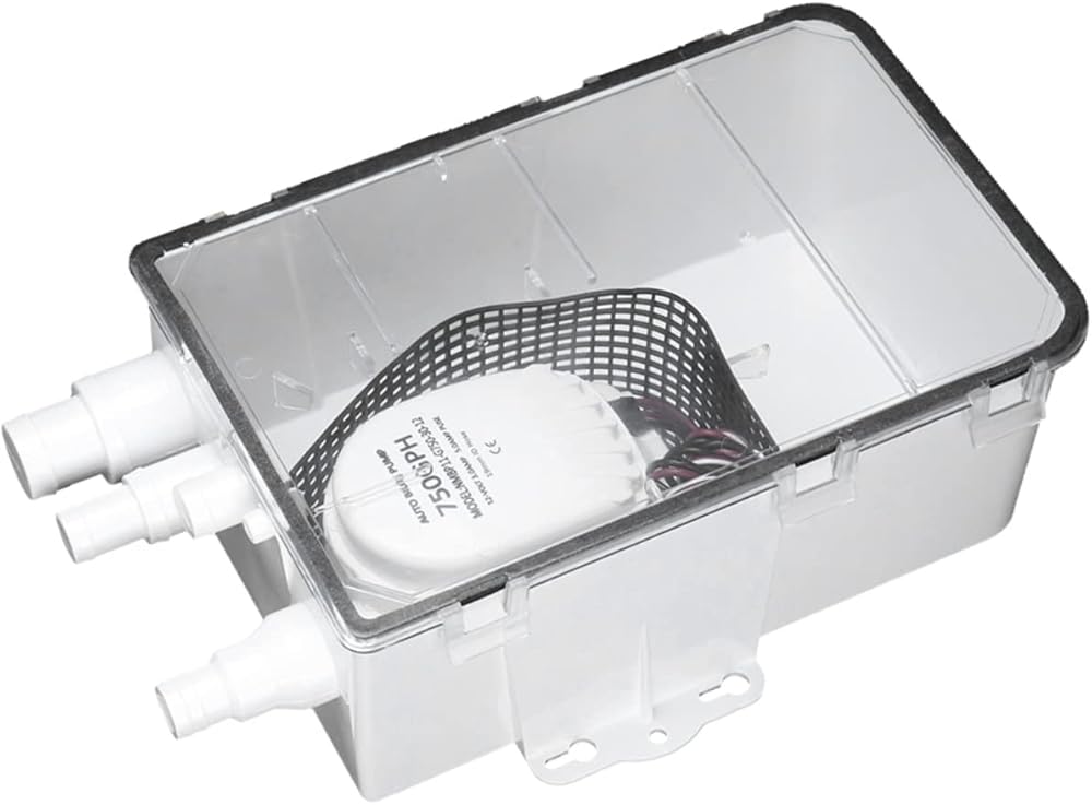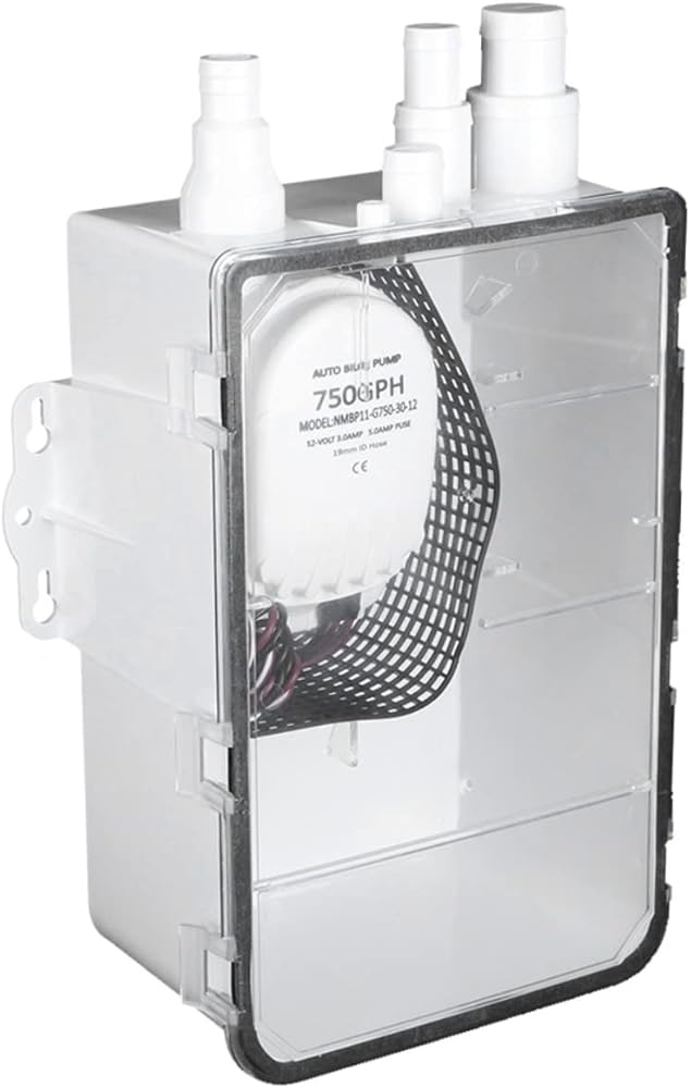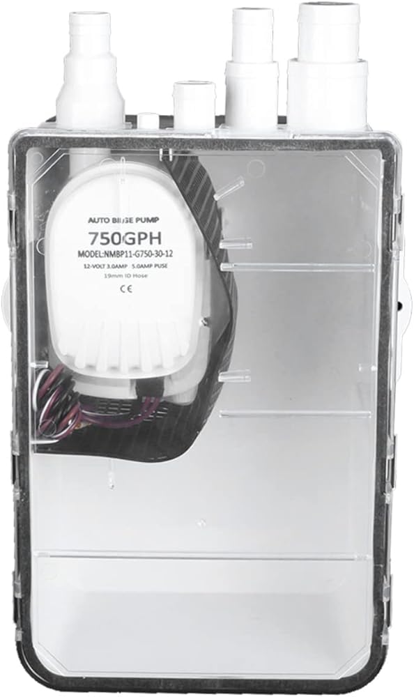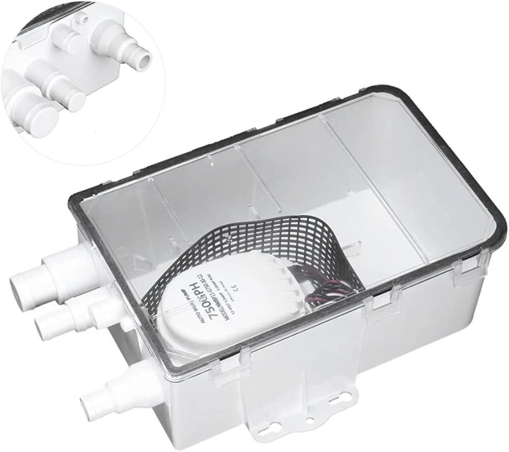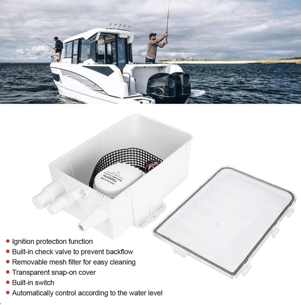 نظام مضخة حوض الدش 750 جيجا في الساعة 12 فولت، منافذ مدخل متعددة، سهلة التركيب، محمية من الإشعال، غطاء شفاف، صمام فحص على المخرج