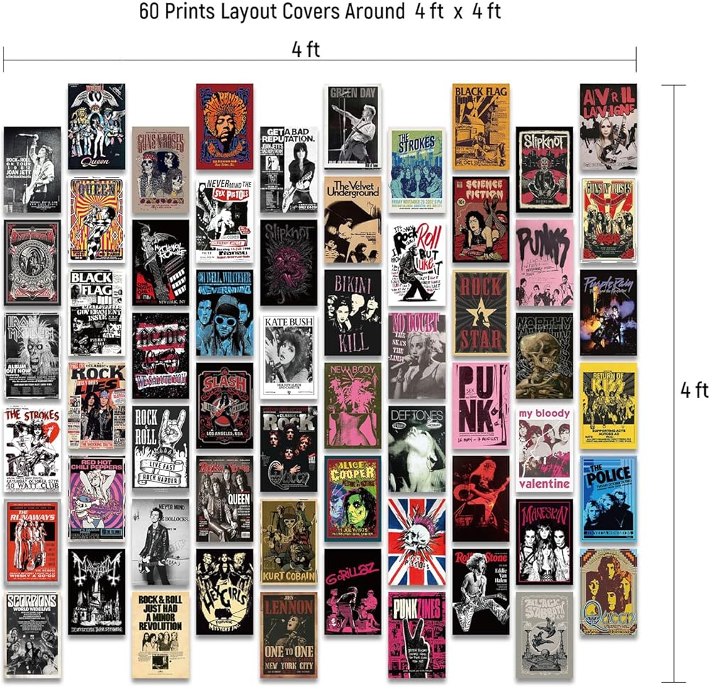 🎵 Dynamic and Iconic Artwork: Each of the 60 prints in this collage set features vibrant, bold designs that capture the essence of punk and hip hop culture. Perfect for fans of hip hop, rap, and punk music, these prints highlight legendary artists and bands, infusing your space with their rebellious spirit.