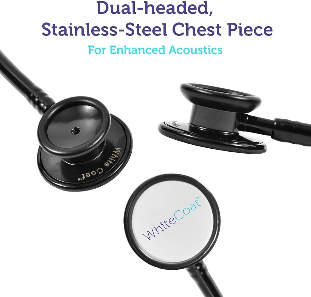 Completely Handcrafted And Enhanced For Acoustics, Our Jet-Black Stethoscope Is Manufactured With Thick-Walled, Single Tubing For More Clarity, Silicone Ear Tips For Less Ear Discomfort, And A Dual-Head, Stainless-Steel Chest Piece To Pick Up Even The Faintest Of Sounds During Examinations. Use The Diaphragm For High Frequency Heart Sounds And The Bell For Lower Frequency Lung Sounds. White Coat's Professional Stethoscope Will Be The Perfect Addition To Your Medical Kit!
