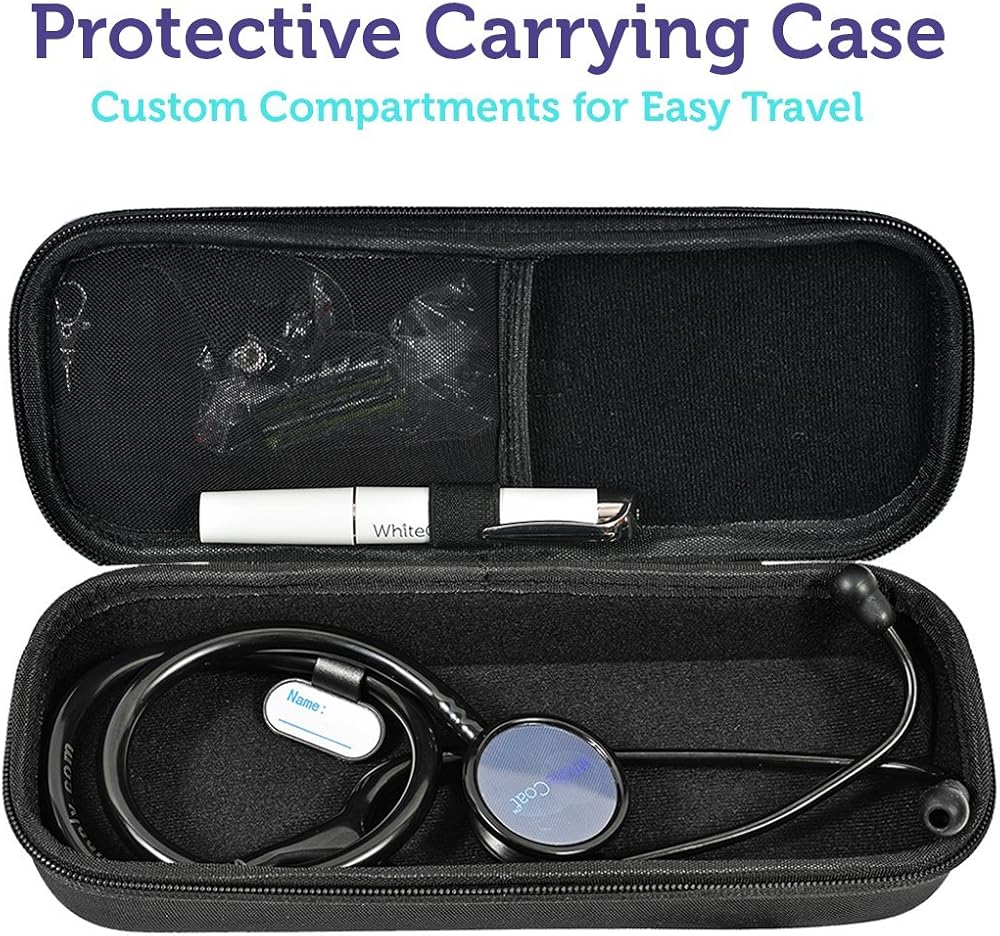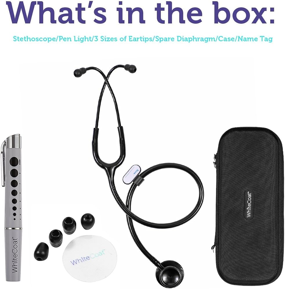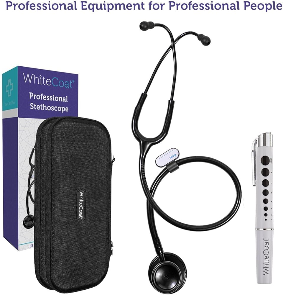 White Coat Professional Stethoscope And Protective Case - Jet Black With Led Pen Light Pupil Gauge For Nurses, Ems, Medical Students, Emergency Room Perfect For All Medical Personnel