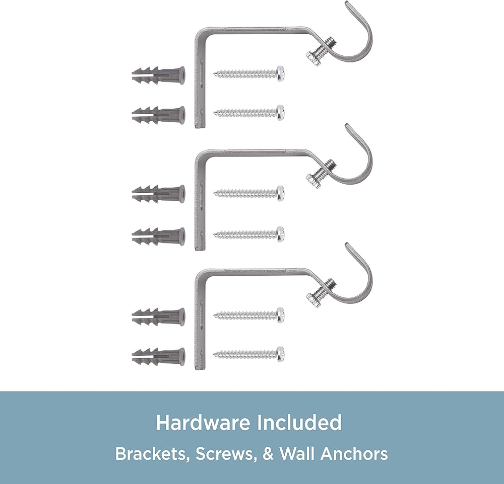 Includes: one telescoping curtain rod with finials, two brackets, one center support, screws, drywall anchors, and installation instructions