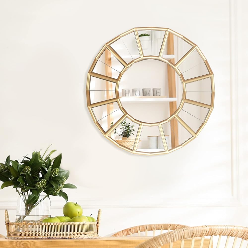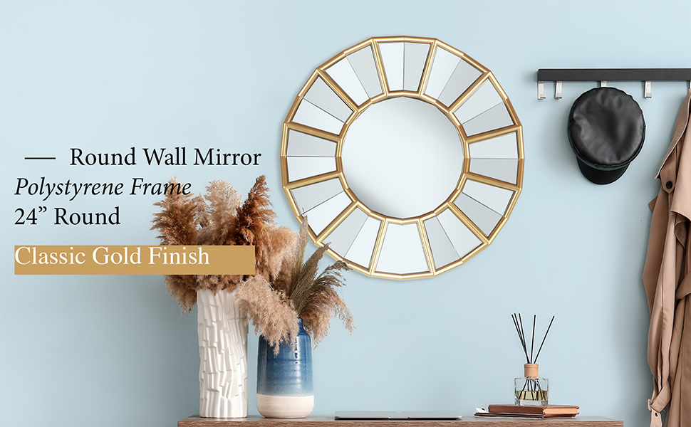 VINTAGE STYLE & PERFECT SIZE: This decorative gold circle mirror for wall measures 24 x 24 inches with 0.5-inch depth. Give a chic touch to your home with this vintage gold round mirror set. It also performs well with the high HD clarity glass which instantly doubles the light and visual depth without distortion so that it makes the space appear larger. This gold round mirror suits a range of schemes, and it is a perfect wall décor for living rooms, bedrooms, hallways, entryways and bathroom