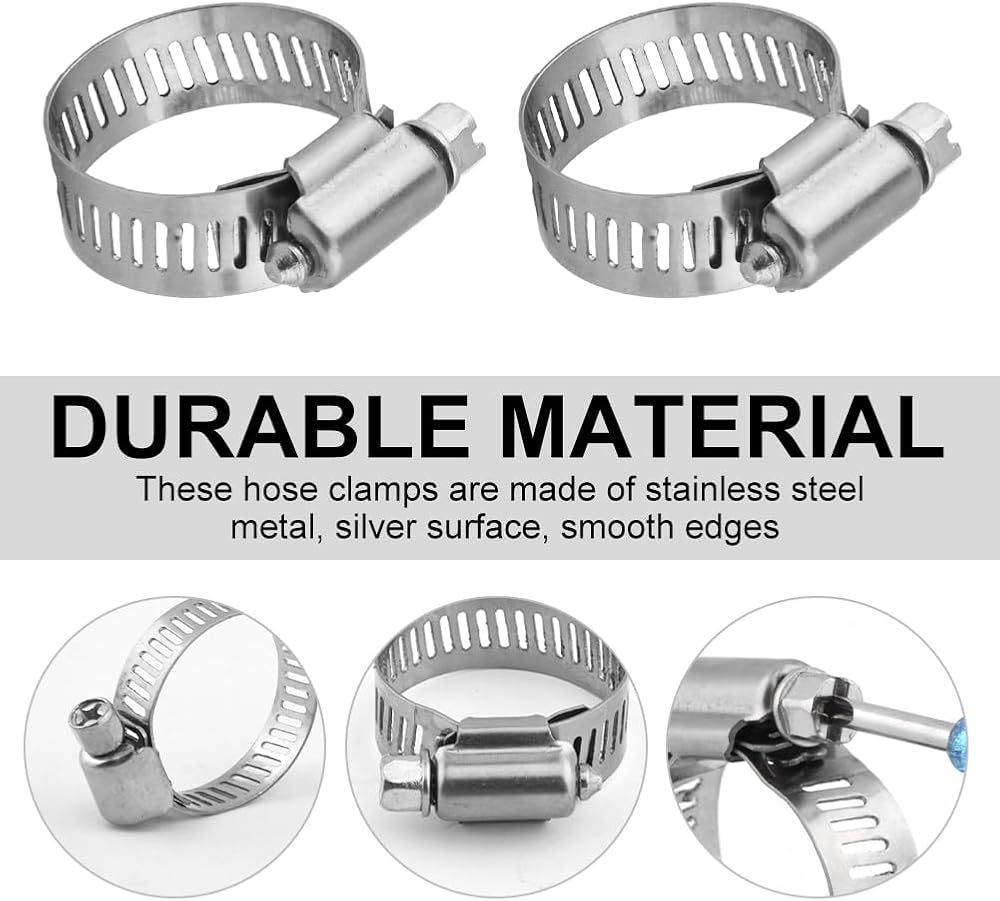 ?DURABLE MATERIAL?These hose clamps are made of stainless steel metal, silver surface, smooth edges, sturdy and durable, not easy to deform or break, weatherproof, and can be used for a long time.