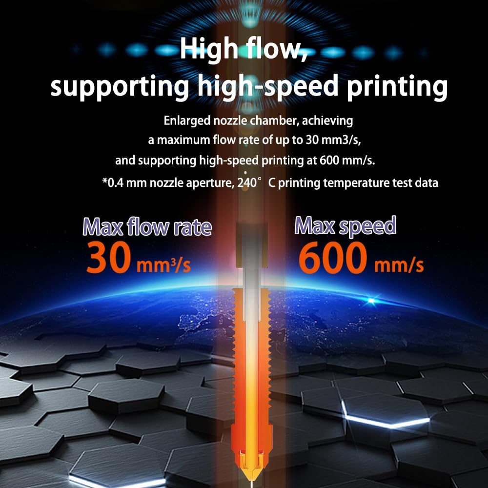 • 【High-flow Printing】Hotend nozzle chamber is enlarged so that when the printing temperature is at 240°, the maximum flow rate can be up to 30mm3, supporting 600mm/s high-speed printing.