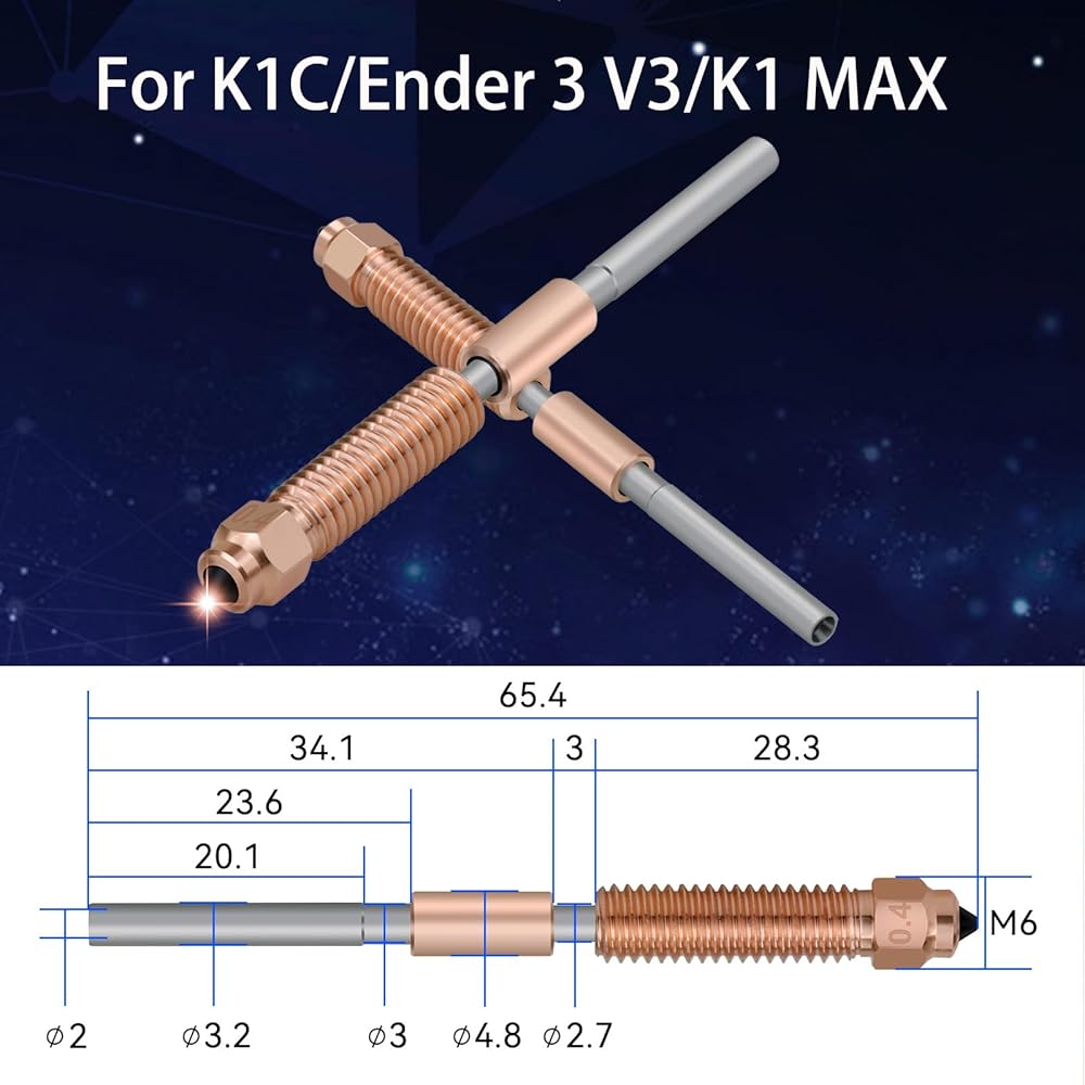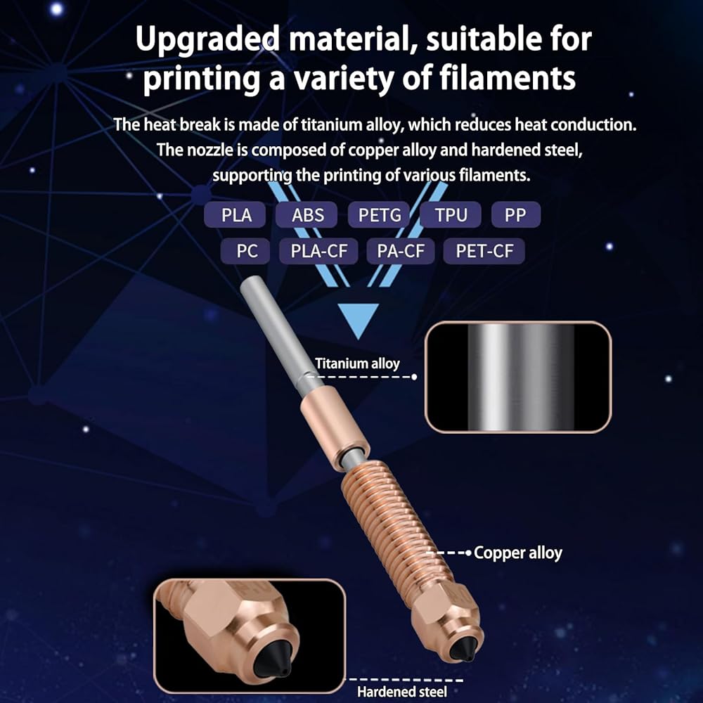 • 【Upgraded Material】The heat break of Ender 3 V3 Nozzle is made of titanium alloy, which can effectively reduce heat conduction. The K1C nozzles are made of copper alloy and hardened steel bimetallic material, high thermal conductivity, high hardness, better performance. Support PLA, ABS, PETG, TPU, PP, PC, PLA-CF, PA-CF, PET-CF multiple filaments printing.
