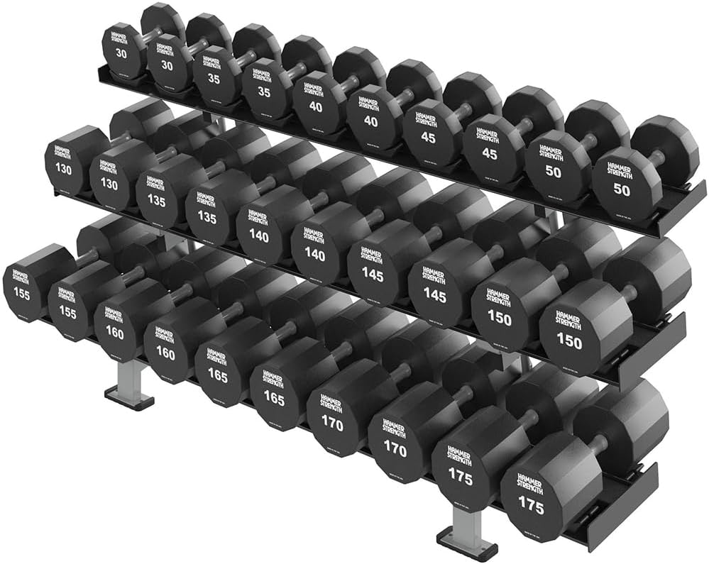 Hammer Strength premium urethane dumbbells are made in the US and offer superior durability with an injection-molded exterior and high-grade steel. Precision machined handles and high-grade steel heads, protected by nearly indestructible materials for peak performance.