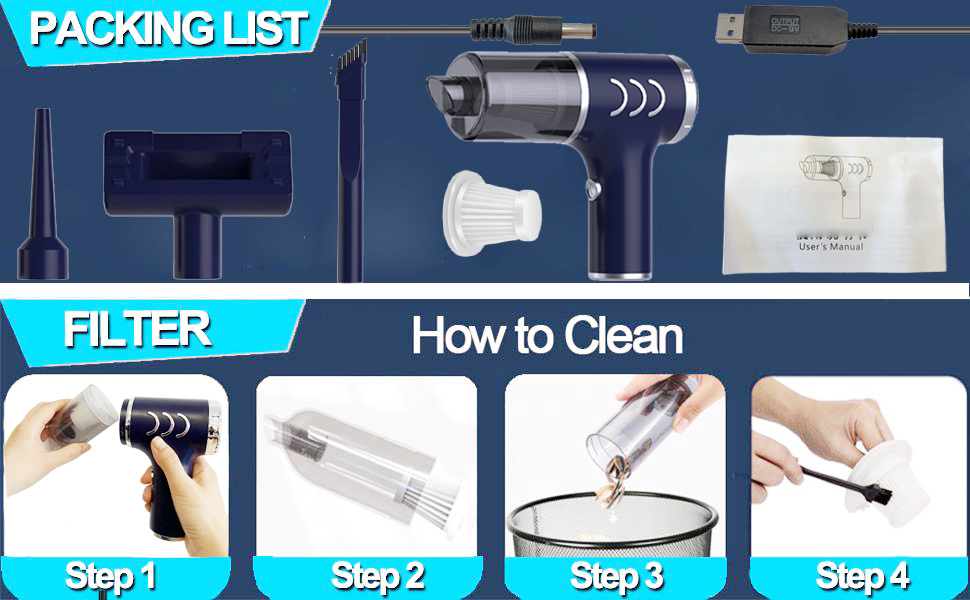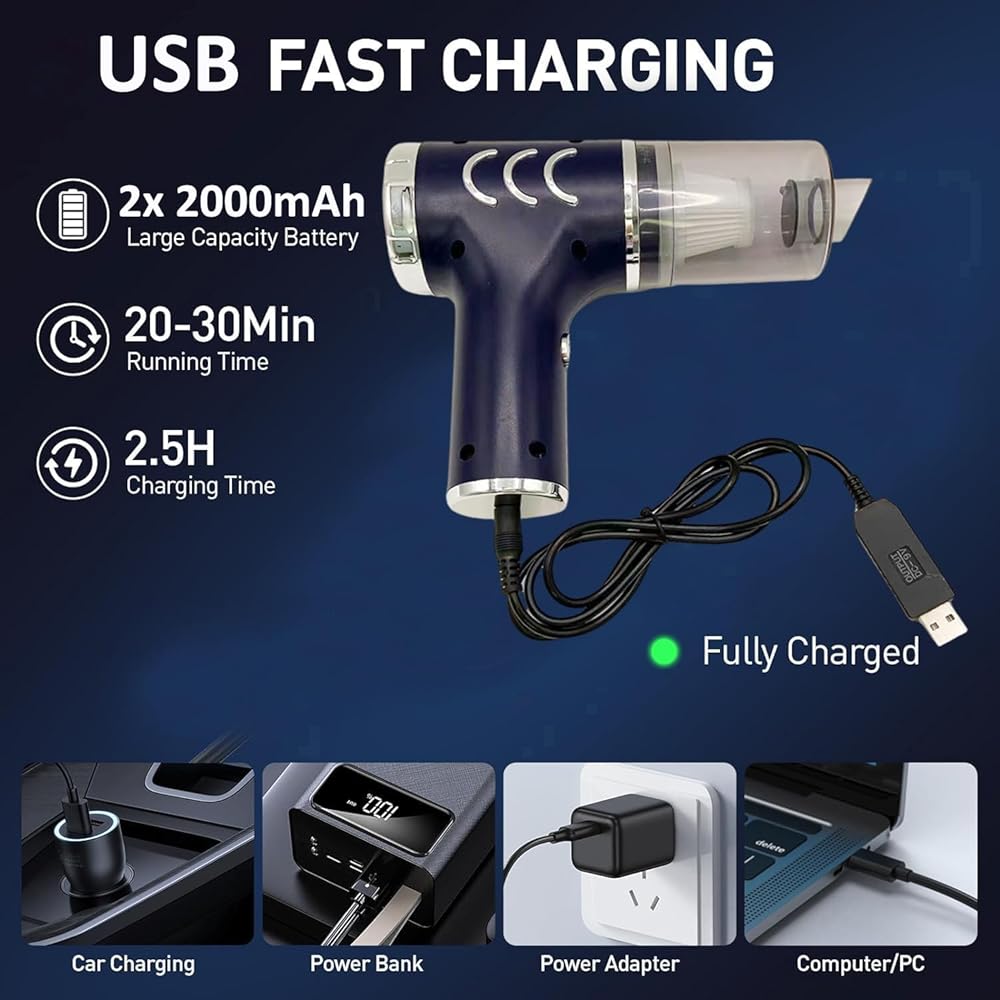 🔋【بطارية قابلة للشحن وشحن سريع】تحتوي المكنسة الكهربائية الكهربائية على بطارية مدمجة بقوة 4000 مللي أمبير في الساعة مع منفذ شحن سريع. يمكن شحنه بسهولة باستخدام شاحن سيارة، طاقة متنقلة، كمبيوتر محمول، بطارية قابلة للشحن، وغيرها من الطرق. يستغرق الشحن 3 ساعات فقط. تعد هذه المكنسة الكهربائية القابلة لإعادة الاستخدام بديلاً مثاليًا لعلب الهواء المضغوط وهي صديقة للبيئة وموفرة للطاقة. كما أنه يوفر المال والوقت.