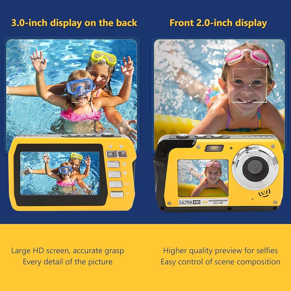 SELFIE DUAL SCREEN DESIGN: This waterproof digital camera has a rear 3.0" IPS screen and a front 2" IPS screen, so you can easily take selfies with the push of a screen switch button, and more conveniently, the waterproof digital camera has built-in 2-second, 5-second, and 10-second selfies, so you'll never miss a shot of your exciting life.
