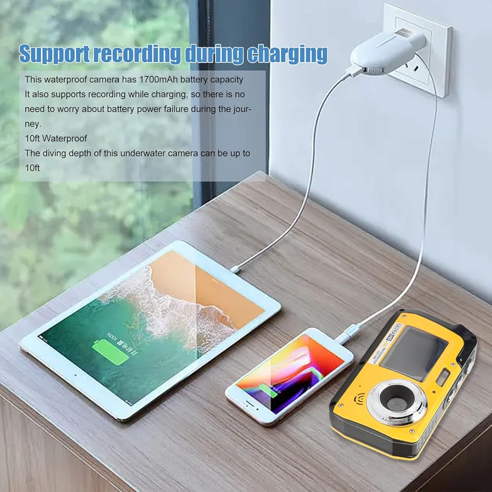 SUPPORT RECORDING WHILE CHARGING: This waterproof camera has a 1700mAh battery capacity, which supports recording while charging. Two power supply options: 1) Equipped with 1 battery, the battery can record about 90 minutes of video and 150 minutes of photos when fully charged. 2) You can also use an external power supply to power the camera from an external power source via USB connection for extended use when shooting outdoors.