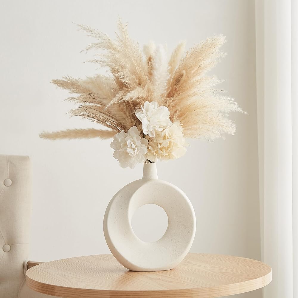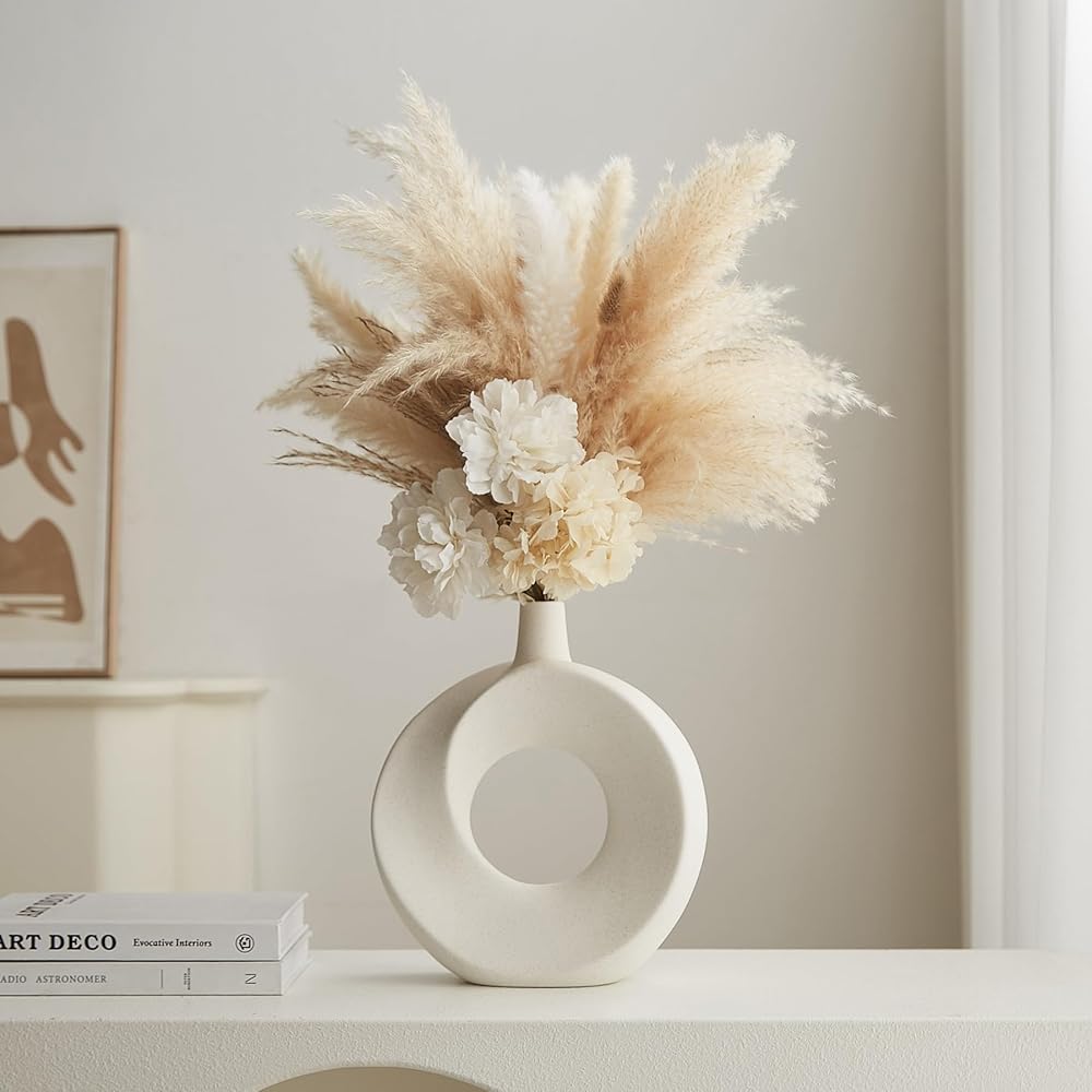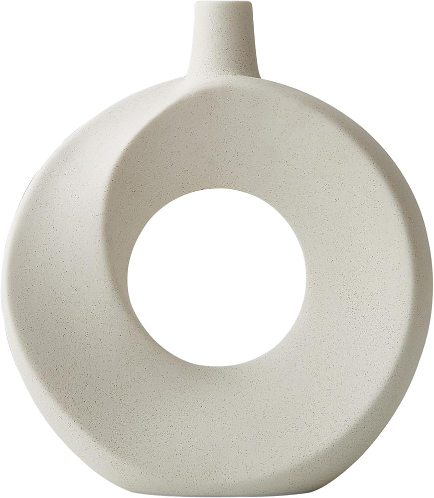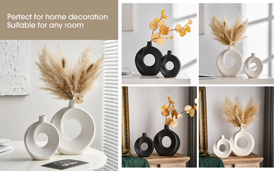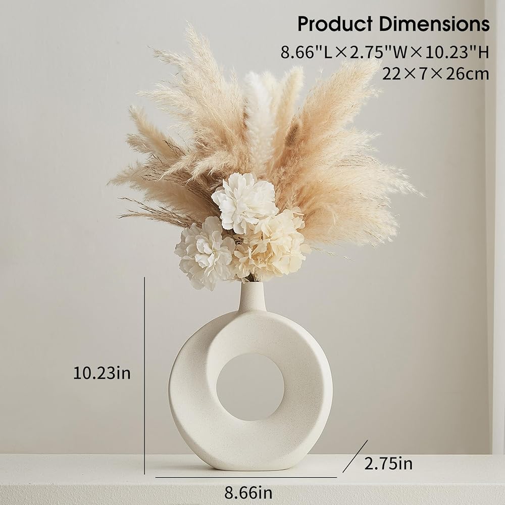 Product Benefit: Decorate your home with these modern white ceramic donut vases that add a touch of boho charm to any space. Set of 2 hollow flower vases perfect for displaying fresh blooms or vibrant faux flowers.