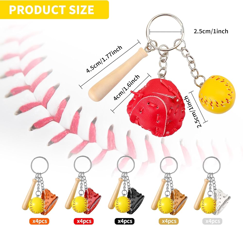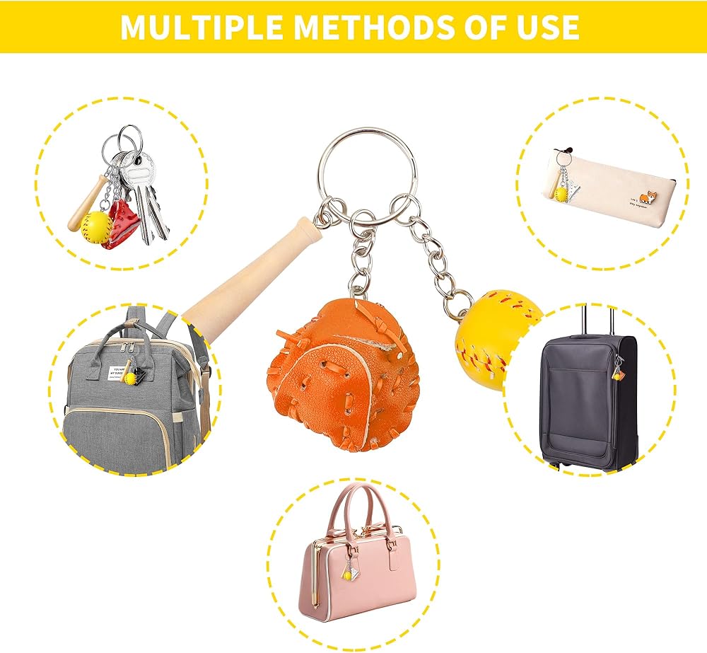 【Size】The diameter of the three piece baseball key chain ring set is 2.54cm/1inch; The length of the rod is 4.5cm/1.8inch, the size of the baseball is 1.78cm/0.7inch, and the size of the baseball glove is 3.8x3.5cm/1.5x1.37inch, which is small and easy to carry