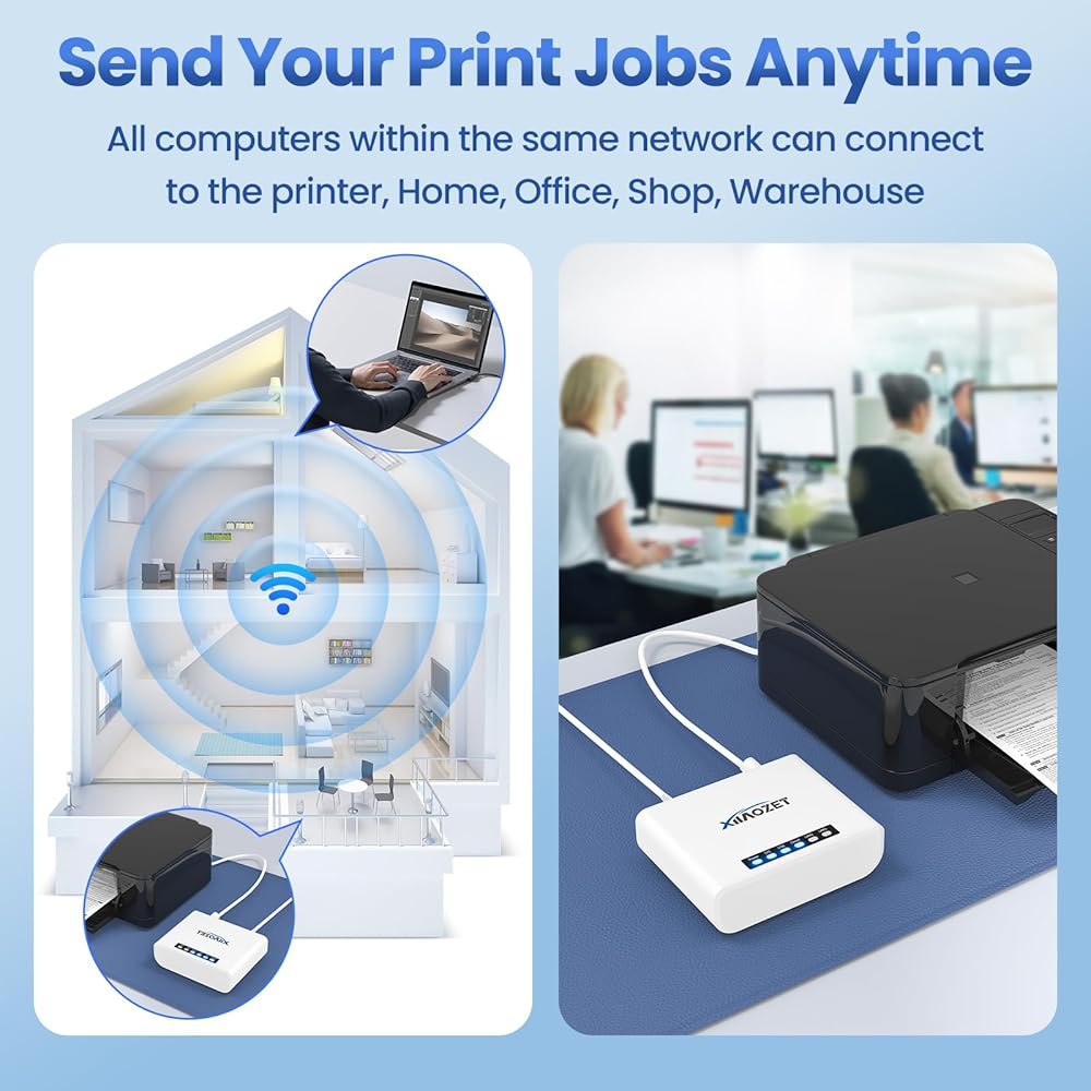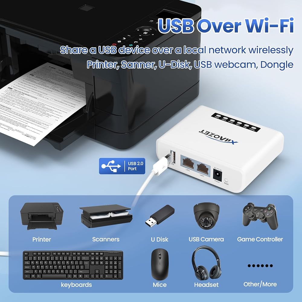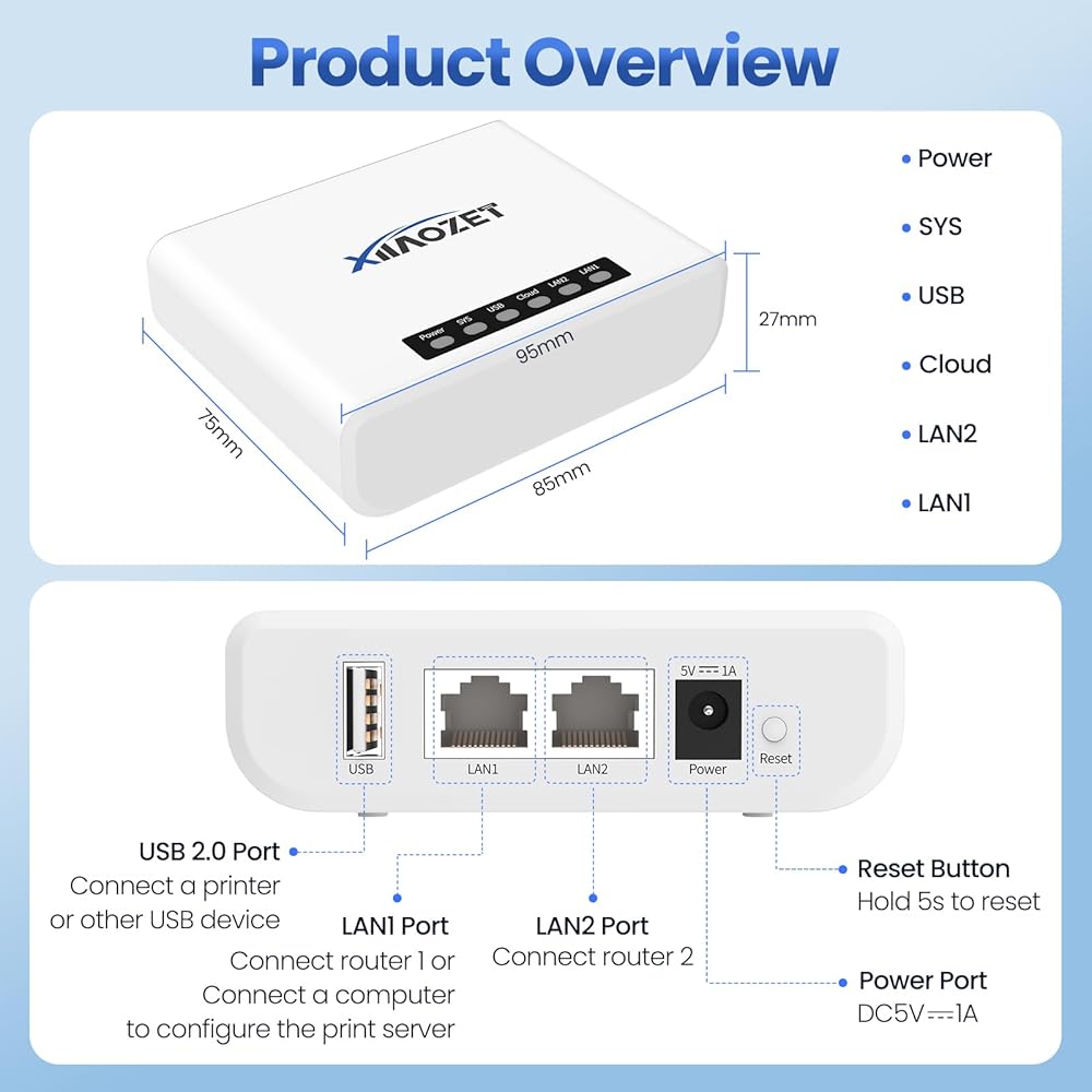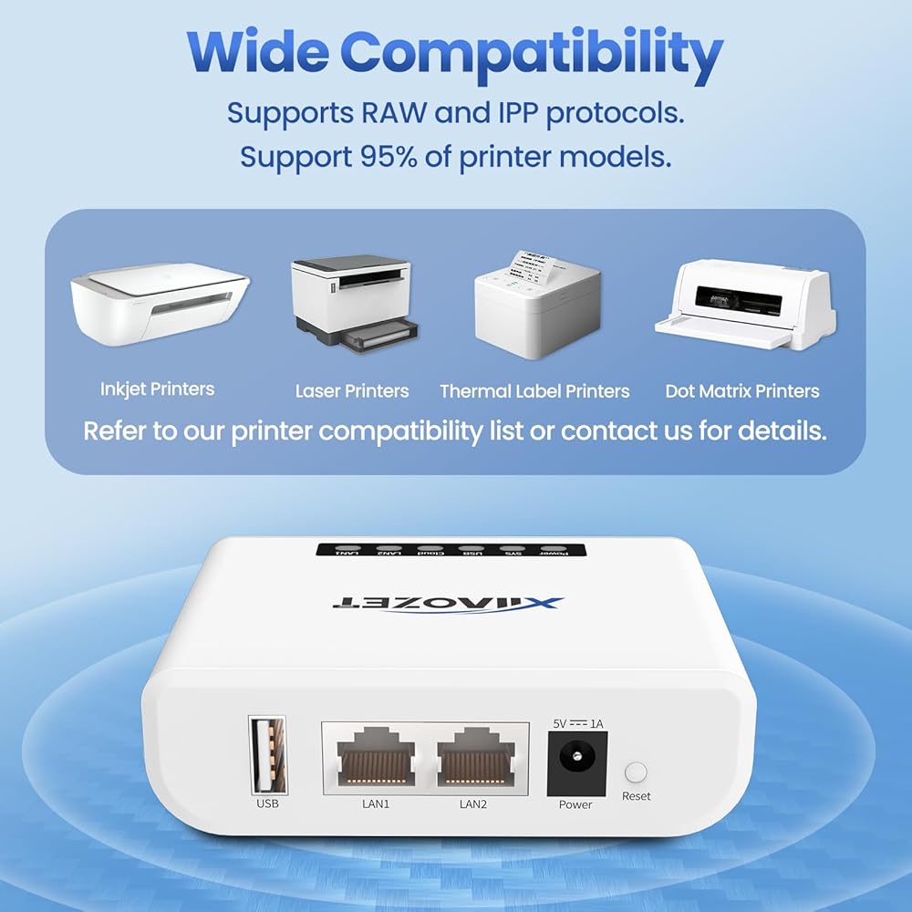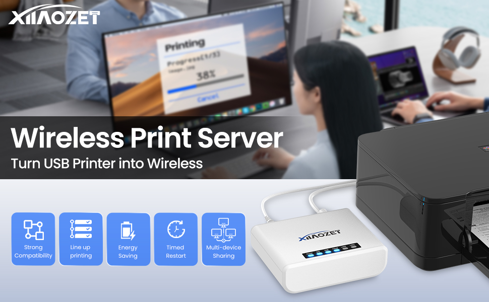 مشاركة الطباعة: يدعم خادم الطباعة Xiiaozet USB وظائف طباعة RAW والصور وطباعة النص والمسح الضوئي. فهو يحول طابعات USB إلى طابعات شبكة، مما يتيح لأجهزة كمبيوتر متعددة استخدام ثلاث طابعات داخل نفس الشبكة، في وقت واحد دون التبديل. تعمل قائمة انتظار مهام الطباعة التلقائية على تحسين أداء الطابعة واستخدامها، مما يتيح الإدارة المركزية.