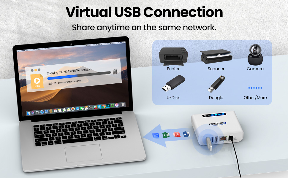 دعم ما يصل إلى 3 أجهزة USB: باستخدام تقنية USB الافتراضية في منافذ USB2.0، يمكن للمستخدمين مشاركة ما يصل إلى 3 أجهزة USB (مثل الطابعات أو الماسحات الضوئية أو أجهزة الدونجل) داخل شبكة محلية، مما يحقق نفس وظائف الاتصالات المادية دون الحاجة إلى اتصال بالإنترنت. الحاجة إلى اتصالات جسدية فعلية.