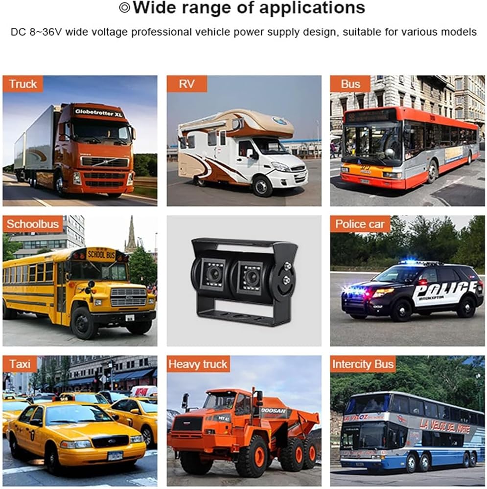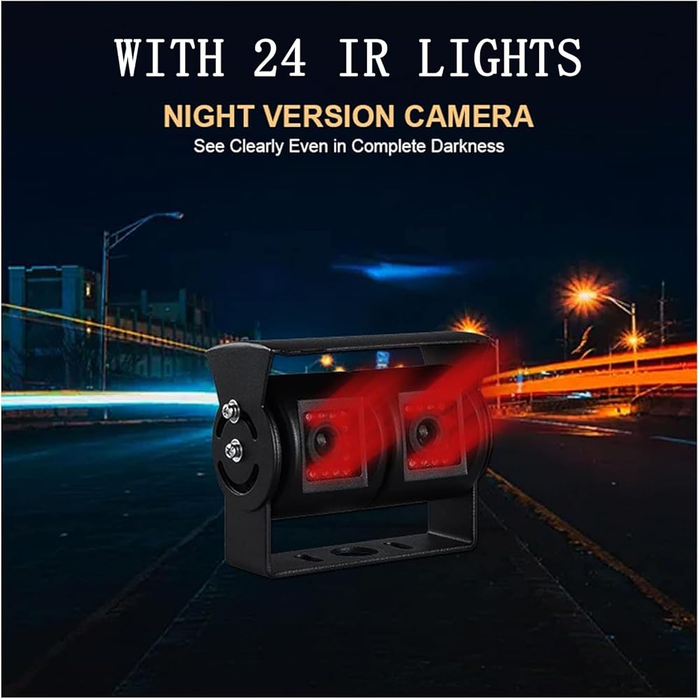 【DUAL CAMERA】:Adopting Dual Camera Metal Design, Corrosion Resistant, Waterproof and Wear-Resistant. Each Camera Has 12 Led Lights, Night Vision Distance Up To 15 Meters, Perfect for Caravans, Trucks and Cars.
