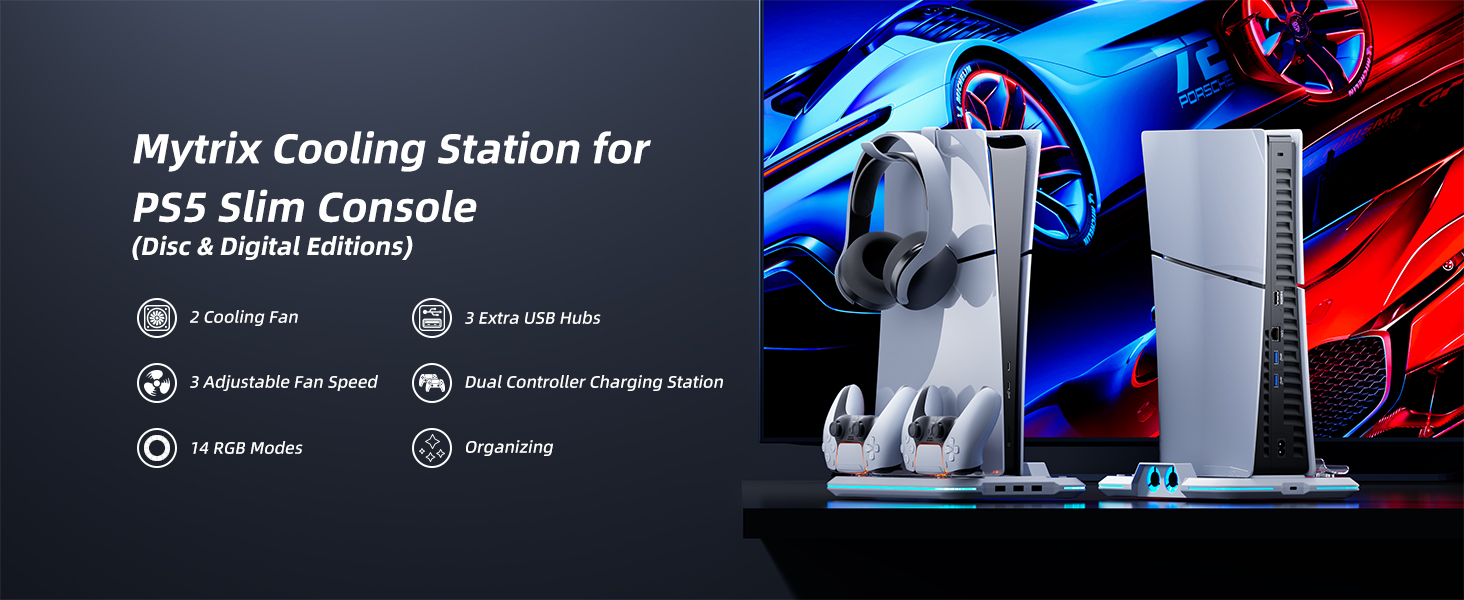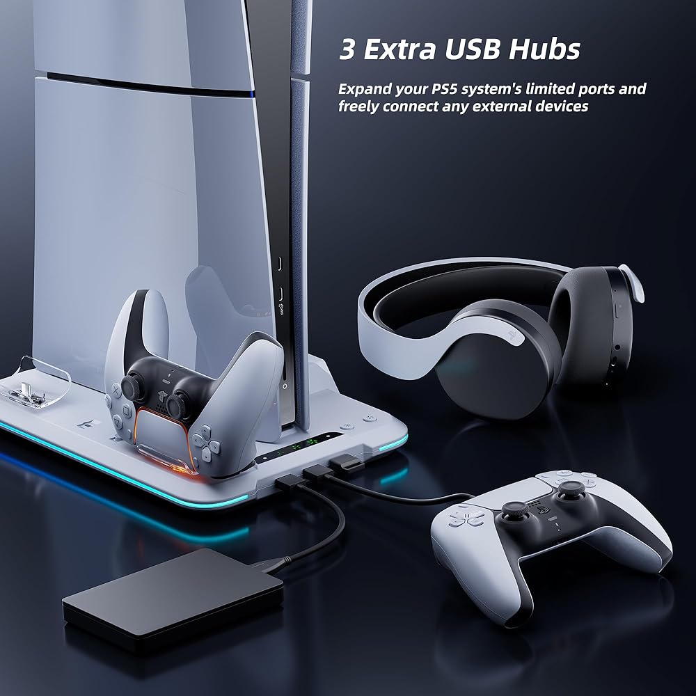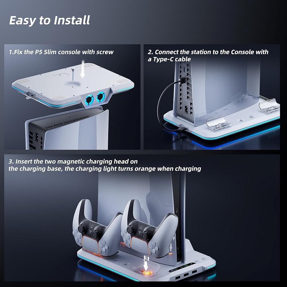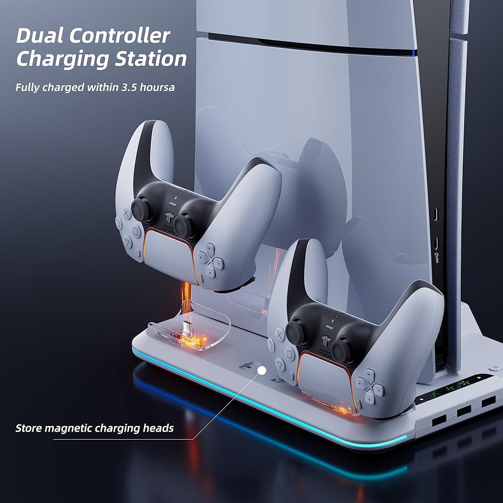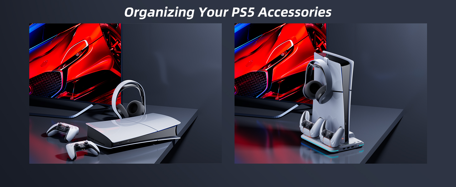 【حامل تبريد صغير الحجم لملحقات PS5 Slim】يمكنك حمل وحدة التحكم PS5 النحيفة وسماعات الرأس ووحدة التحكم المزدوجة في مكان واحد. لا تشغل مساحة أكبر وتحافظ على ملحقات ps5 الخاصة بك جميلة ومنظمة مع الحفاظ على مظهر مرتب. يتناسب حامل الشحن النحيف لجهاز PS5 هذا مع أي حجم مكتبي صغير الحجم