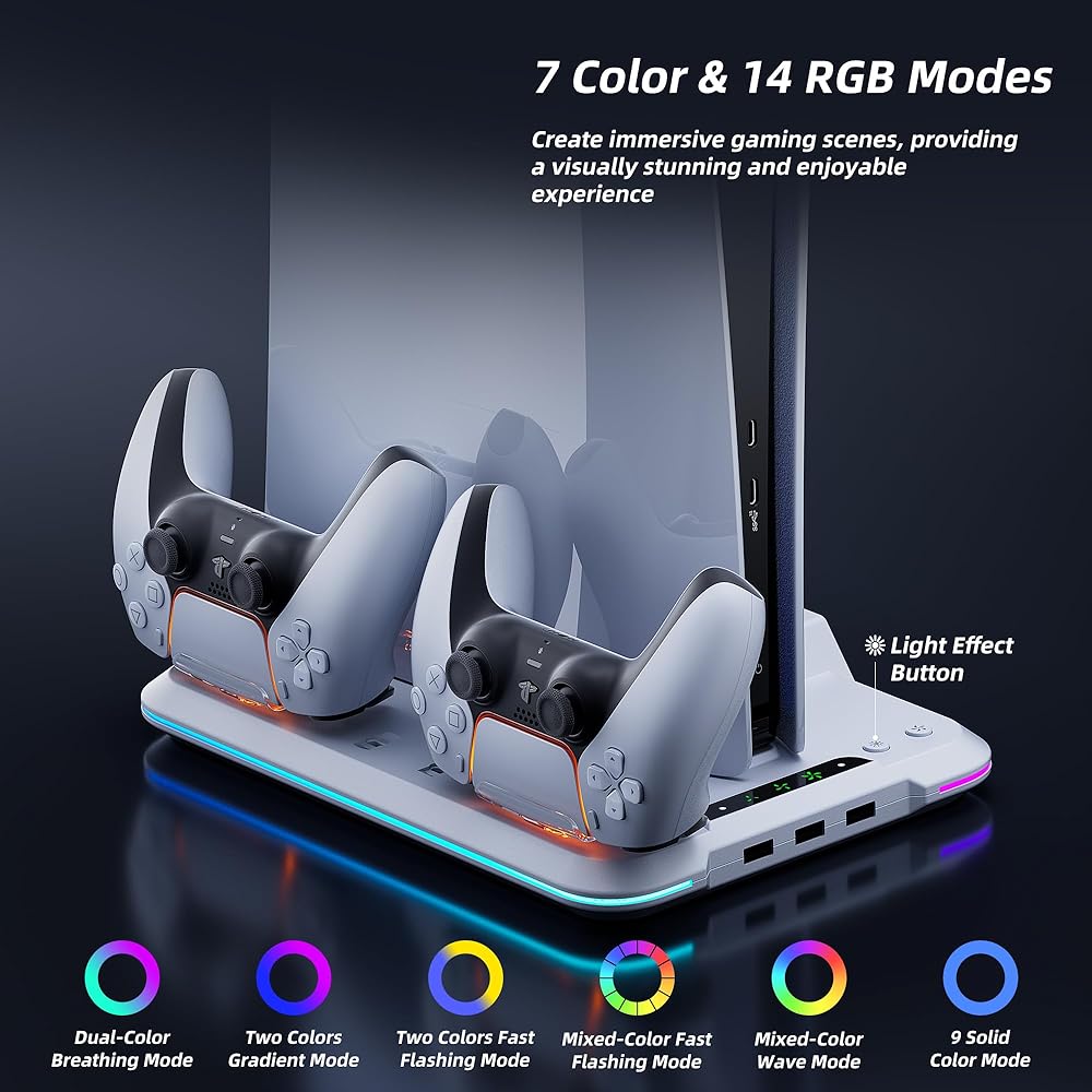 【إضاءة RGB رائعة】يتميز حامل الشحن النحيف لجهاز PS5 بـ 7 أضواء ملونة و14 وضعًا RGB، بما في ذلك وضع اللون الواحد، ووضع التنفس الملون، ووضع موجة الألوان المختلطة. ببساطة عن طريق الضغط على مفتاح الإضاءة LED، يمكنك ضبط الألوان والأوضاع لتتناسب مع الألعاب المختلفة. يخلق حامل RGB PS5 النحيف مجموعة نابضة بالحياة من الألوان ومشاهد ألعاب غامرة، مما يوفر تجربة مستخدم مذهلة وممتعة بصريًا