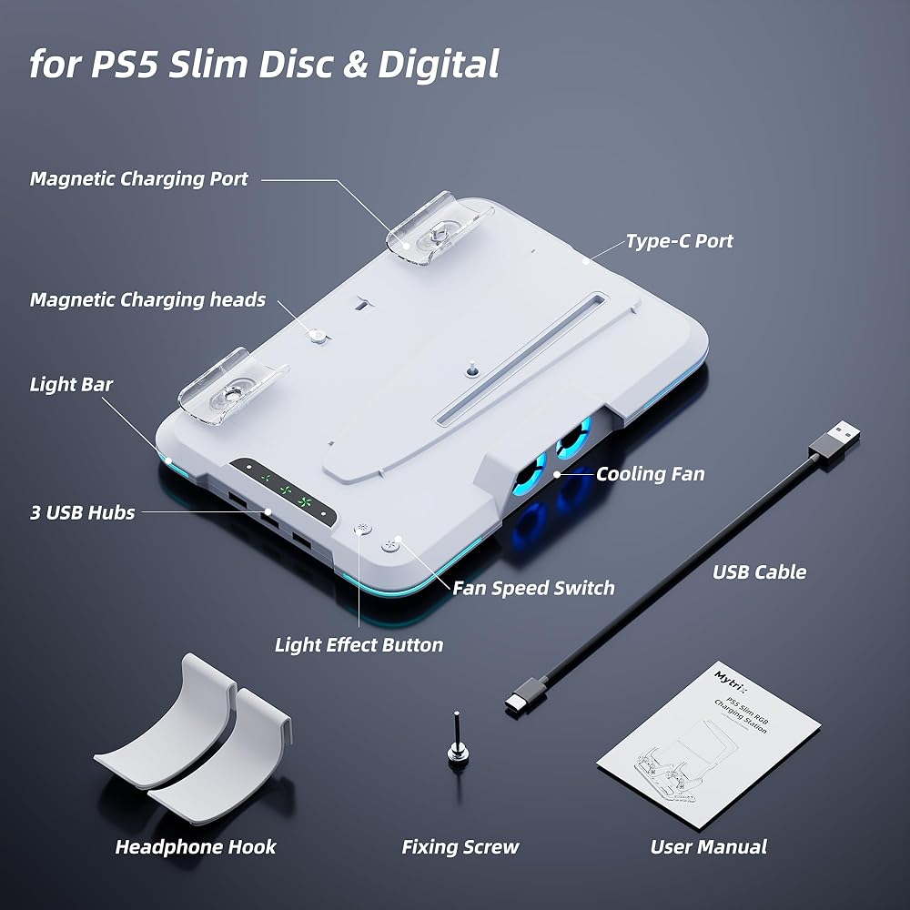 【العبوة وضمان لمدة عام واحد】سوف تحصل على: 1* حامل نحيف لجهاز PS5 أبيض، 1* كابل USB، 1* برغي تثبيت وحدة التحكم، 2*رأس شحن مغناطيسي، 2* خطاف سماعة الرأس، 1*دليل المستخدم