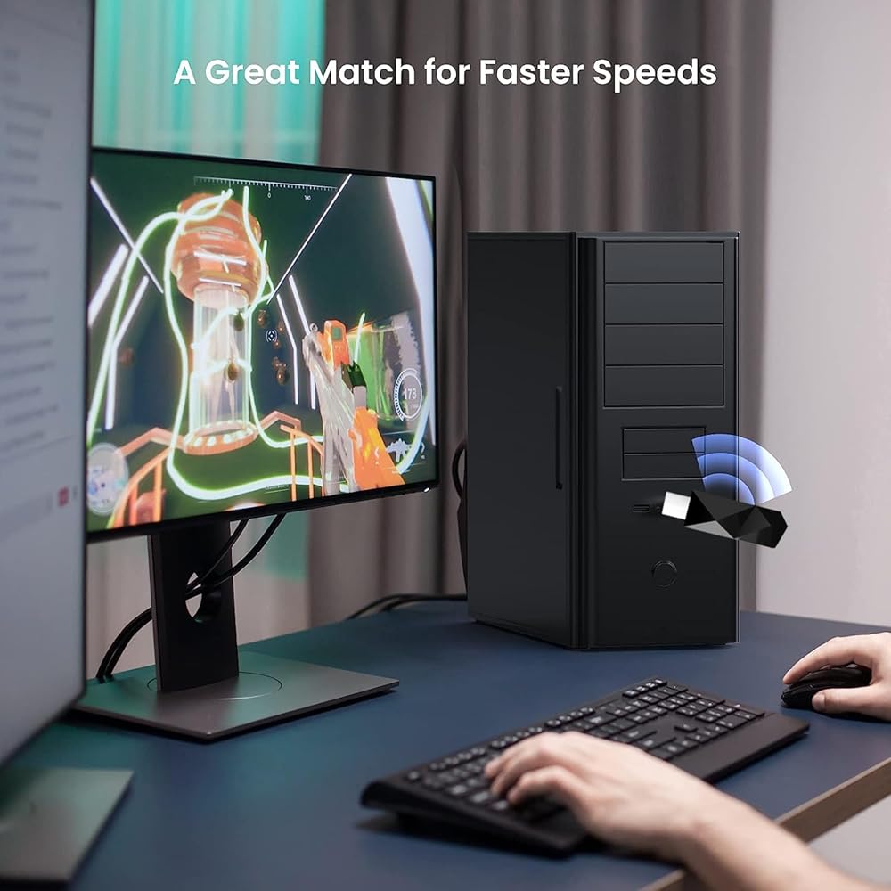 ترقية سرعات النطاق المزدوج: احصل على 1201 ميجا بت في الثانية على 5 جيجا هرتز أو 574 ميجا بت في الثانية على 2.4 جيجا هرتز على سطح المكتب والكمبيوتر المحمول مع محول USB WiFi 6 هذا. فهو يلبي جميع احتياجاتك للبث عالي الدقة والألعاب عبر الإنترنت ومكالمات الفيديو.