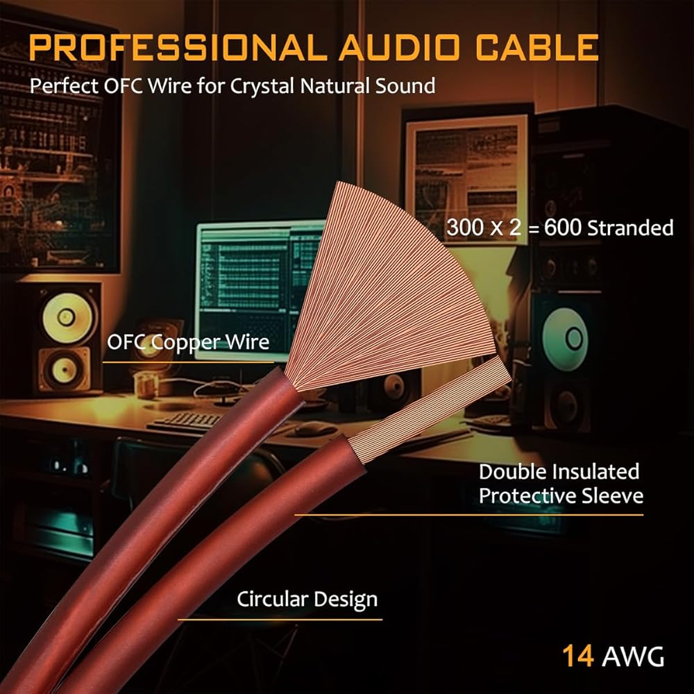 دقة صوت ممتازة: انغمس في دقة صوت لا مثيل لها مع سلك مكبر الصوت المميز ذو قياس 14 الخاص بنا. مصنوع بدقة، كل سلك يتكون من 300 خيط، بإجمالي 600 خيط رائع من النحاس النقي لكل موصل. وهذا يؤدي إلى تجربة الصوت النهائية. بالمقارنة مع أسلاك الألومنيوم المكسوة بالنحاس القياسية، يتميز سلك مكبر الصوت OFC النحاسي النقي بمقاومة أقل بنسبة 30% ومرونة استثنائية، مما يضمن حلاً متينًا يدوم طويلاً يوفر صوتًا واضحًا للغاية لإعداد الصوت الخاص بك.