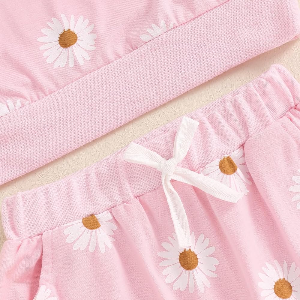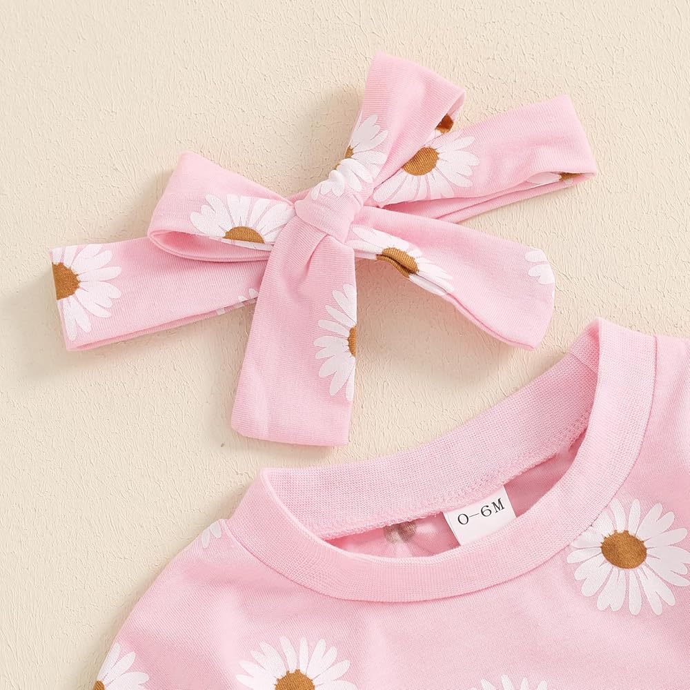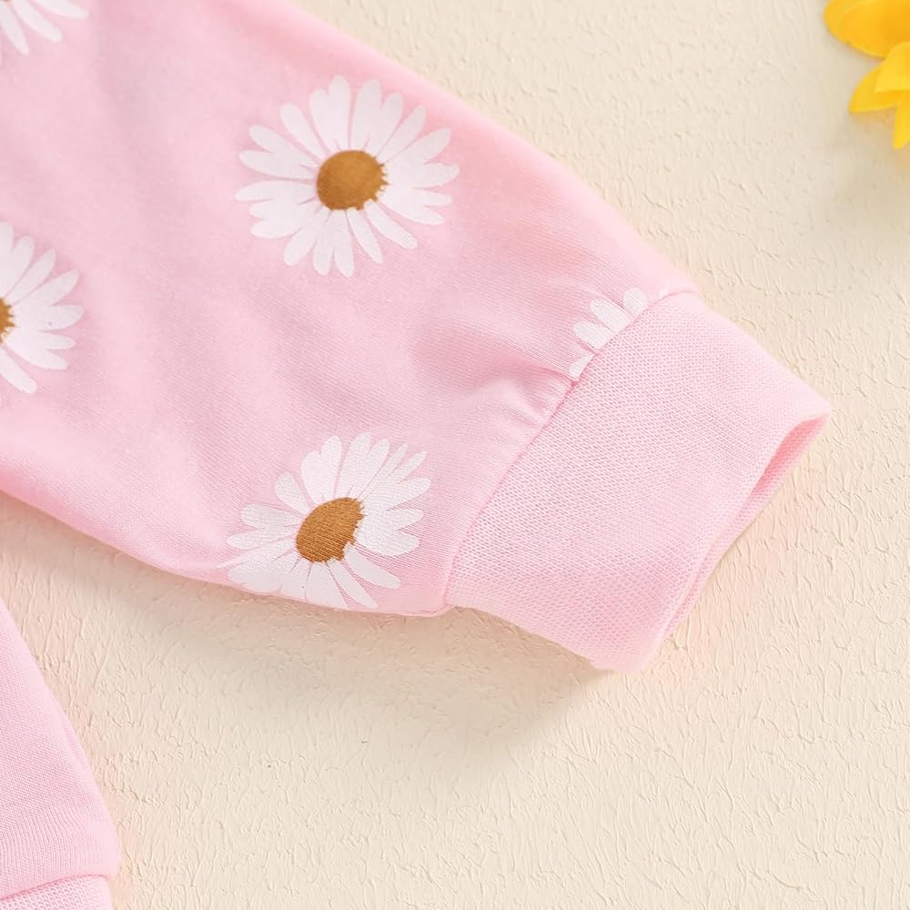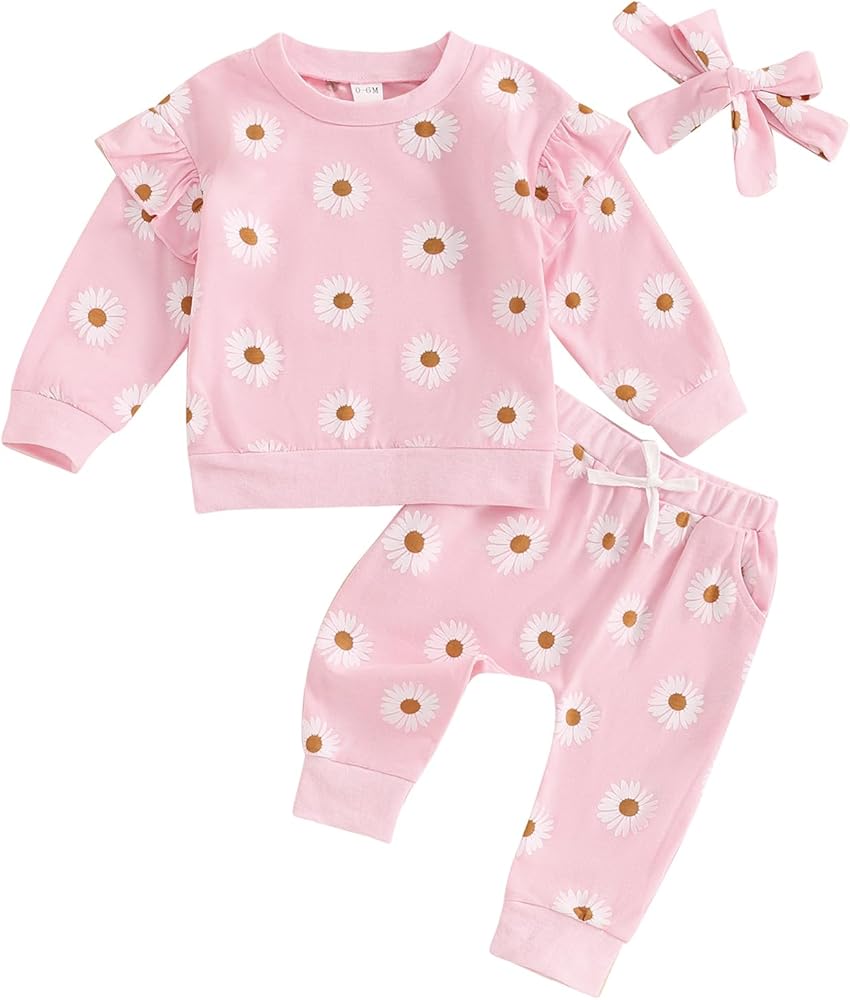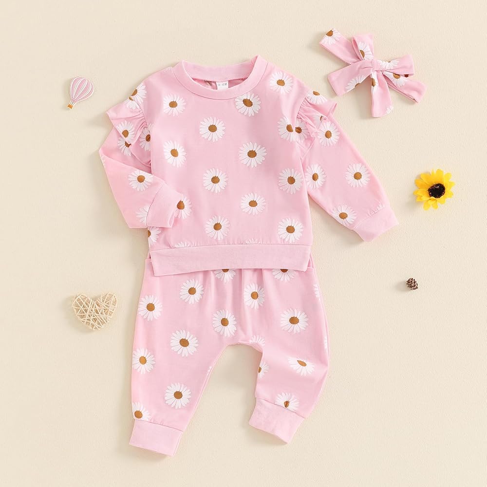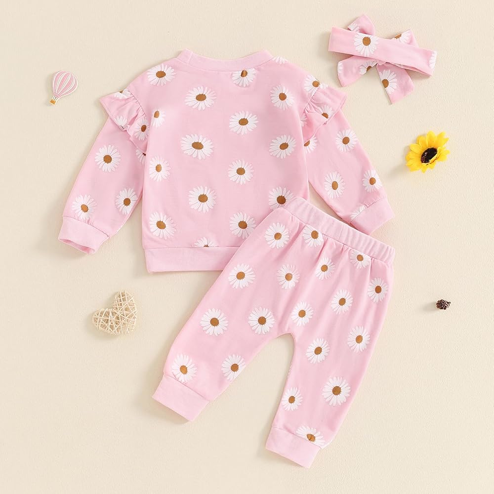Design: Baby girl winter clothes, toddler girl fall clothes, daisy print, long sleeve, fly sleeve, crew neck, baby sweatshirts, matching with elastic waist long pants and headband, bright colors make the baby look cute and lovely.