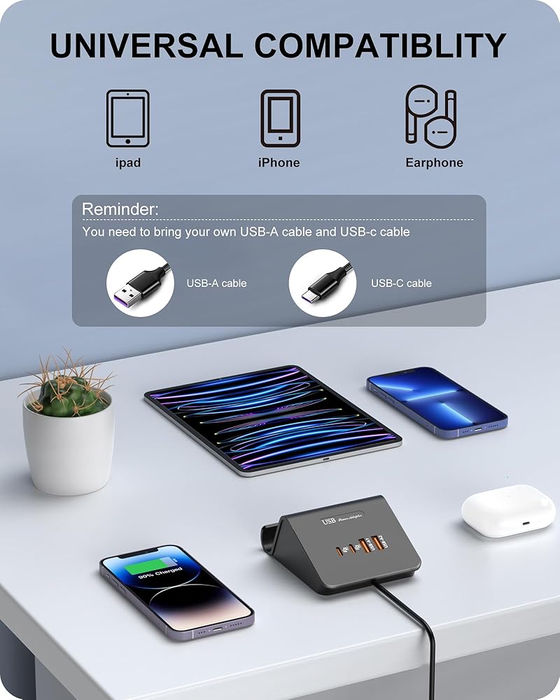 توافق واسع: تصميم محطة شحن USB لسطح المكتب في نوعين من منافذ الشحن، يوفر شحنًا سريعًا لجميع الأجهزة التي تعمل بالطاقة USB-C وUSB-A تقريبًا، من iPhone إلى Samsung والمزيد من أجهزة USB