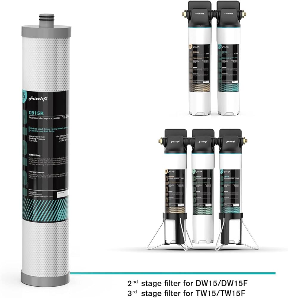 Frizzlife CB15R Replacement Filter For DW15/DW15F/TW15/TW15F Under Sink Water Filter System use 0.5-micron carbon block to get rid of Chlorine, Lead, Other Heavy Metals, Fluoride, Bad Taste & Odor. Also reduces VOC and other common chemicals in the water.