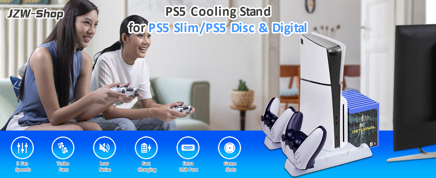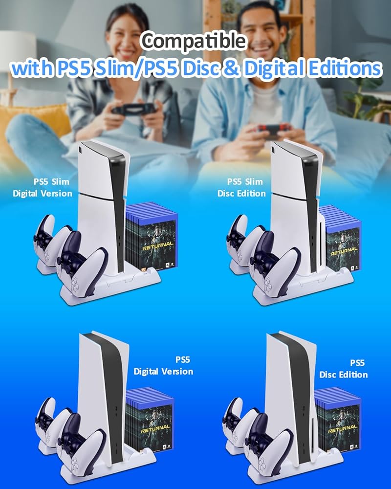 【Cooling Station for PS5 Slim/PS5】The PS5 slim stand is specially designed for 2023 PS5 Slim Disc & Digital and 2020 PS5 Disc & Digital Consoles. This PS5 cooling stand has two efficient cooling fans and dual controller charger, LED indicators, 11 game slots, extra USB port, It's a must have PS5 accessories for PS5 Slim/PS5 gamers.