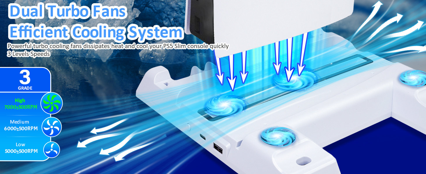 【Efficient Cooling Fan & 3 Adjustable Fan Speeds】The PS5 slim cooling stand with 2 built-in turbo cooling fans and 3 adjustable speeds, which can effectively helps dissipate heat from your PS5 slim console and prevent it from overheating after a long gaming session. Press the fans switch to adjust the speed: Low (5000±500RPM), Medium (6000±500RPM), High (7000±500RPM).